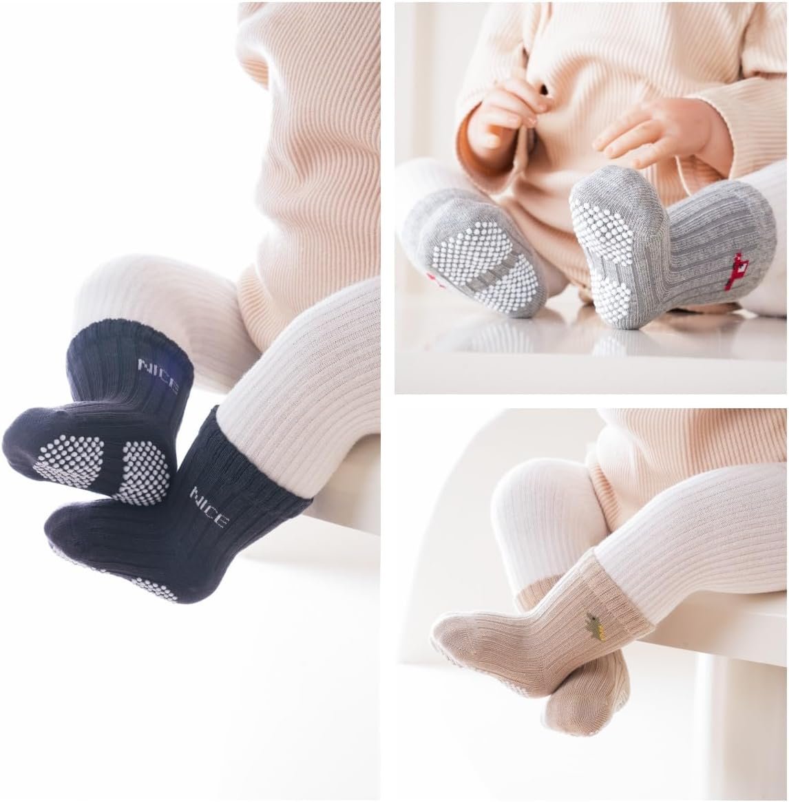 Customers find these socks to be of high quality, with one noting they’re comparable to expensive ones, and appreciate their simple style and slip resistance that stays effective over time. The socks fit true to size and are not too tight or loose, while customers love the colors and find them super soft. They are comfortable, with one customer noting they’re gentle on children’s legs, and customers like their perfect thickness, with one mentioning they’re thick enough for colder months.