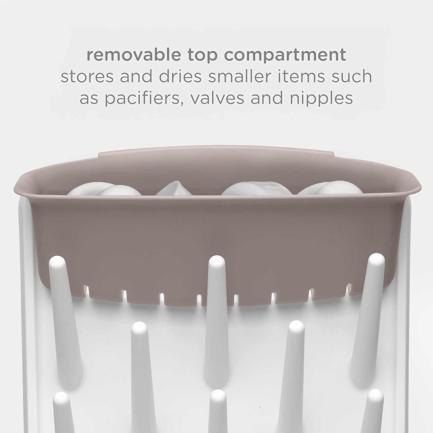 Ubbi’s Vertical Baby Bottle Drying Rack is a must-have baby item for new parents. With 13 pegs, this large capacity drying rack is ideal for drying bottles, breastfeeding pump parts, and various baby feeding accessories. Its sturdy construction features a grip bottom to prevent sliding, ensuring stability for daily use. Capable of holding bottles of all sizes, including glass bottles, this drying rack fits perfectly on your countertop, providing a space-saving storage solution for bottles, toddler cups, and other dishes. It includes a removable top compartment for drying smaller pieces and parts including pacifiers, valves, lids, and nipples, and an innovative removable bottom tray that efficiently collects water to keep your counter dry and tidy. BPA-free and dishwasher safe for easy cleaning and disinfecting, Ubbi’s drying rack is available in modern, neutral colors that add a trendy touch to any kitchen décor. Slim and sleek, this modern drying rack can discreetly fit up against your countertop backsplash or anywhere else in your kitchen. This quick-drying, vertical drying rack is the perfect addition to your baby registry list and a thoughtful gift for new and expecting moms.