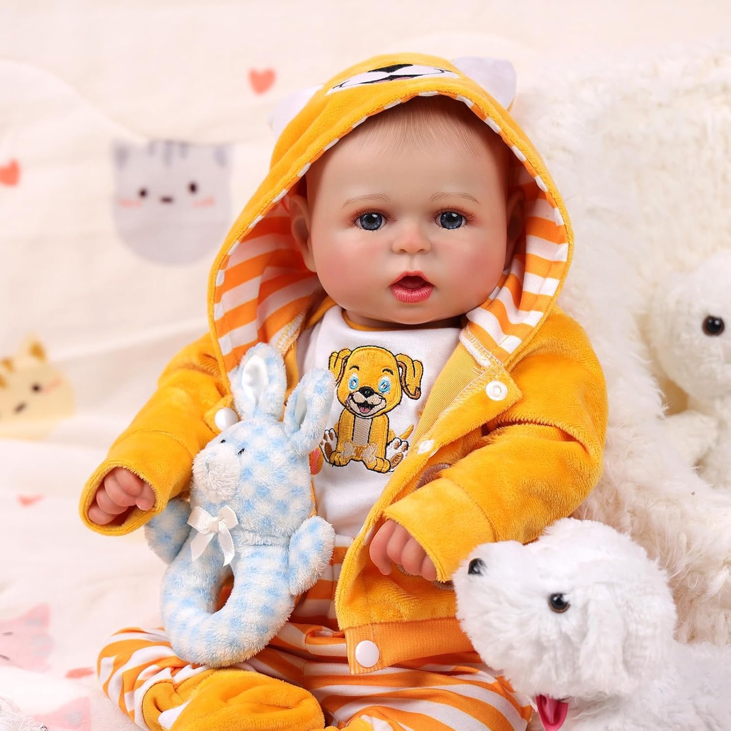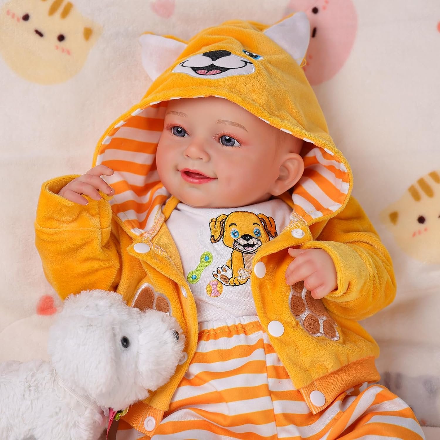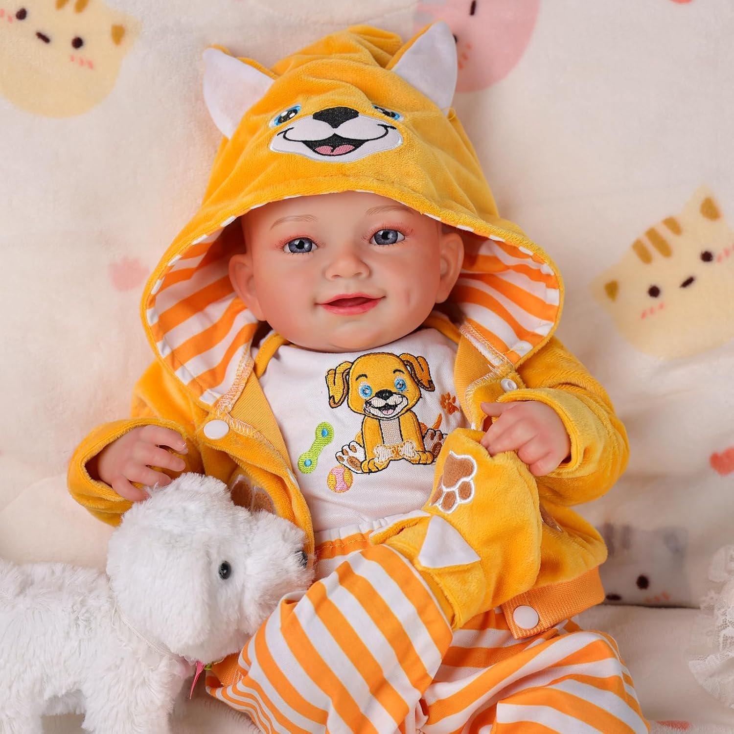 Size For 17-18-19-20-21-22 Inch Baby Dolls Color Yellow, White Pattern Puppy, Stripes Package Included 1*Baby Doll Coat, 1*Baby Doll Clothes, 1*Baby Doll Pants, 1 Pair of Baby Doll Shoes