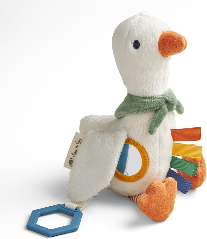 The Itzy Ritzy Bitzy Traveler is a soft sensory car seat toy designed to engage little hands and minds with crinkle sounds, a gentle jingle, and multiple textures that encourage exploration and early development. A perfect gift for new parents, this baby car seat toy provides soothing entertainment in a car seat, stroller, or baby swing, making outings more enjoyable. A secure clip allows for easy attachment to strollers, infant car seats, diaper bags, and activity gyms, keeping it within reach at all times. The adorable goose design adds a whimsical touch, making it ideal for parents looking for engaging car seat toys for infants 0 months and up. Lightweight and portable, this hanging baby toy is perfect for on-the-go fun, serving as a stroller toy, car seat mobile, or sensory play accessory to keep your little one entertained during every adventure.