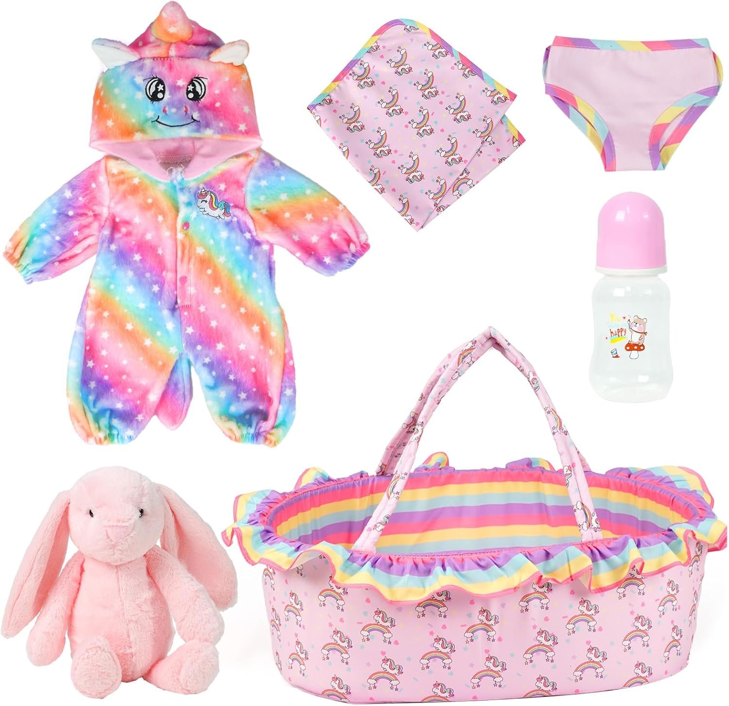 Adorable Reborn Accessories: This baby doll accessories set includes 1* doll bassinet, 1*Unicorn onesie, 1*doll underwear, 1* Bunny toy, 1* towel, 1*hat and 1* feeding bottle, perfect for dressing up your reborn doll