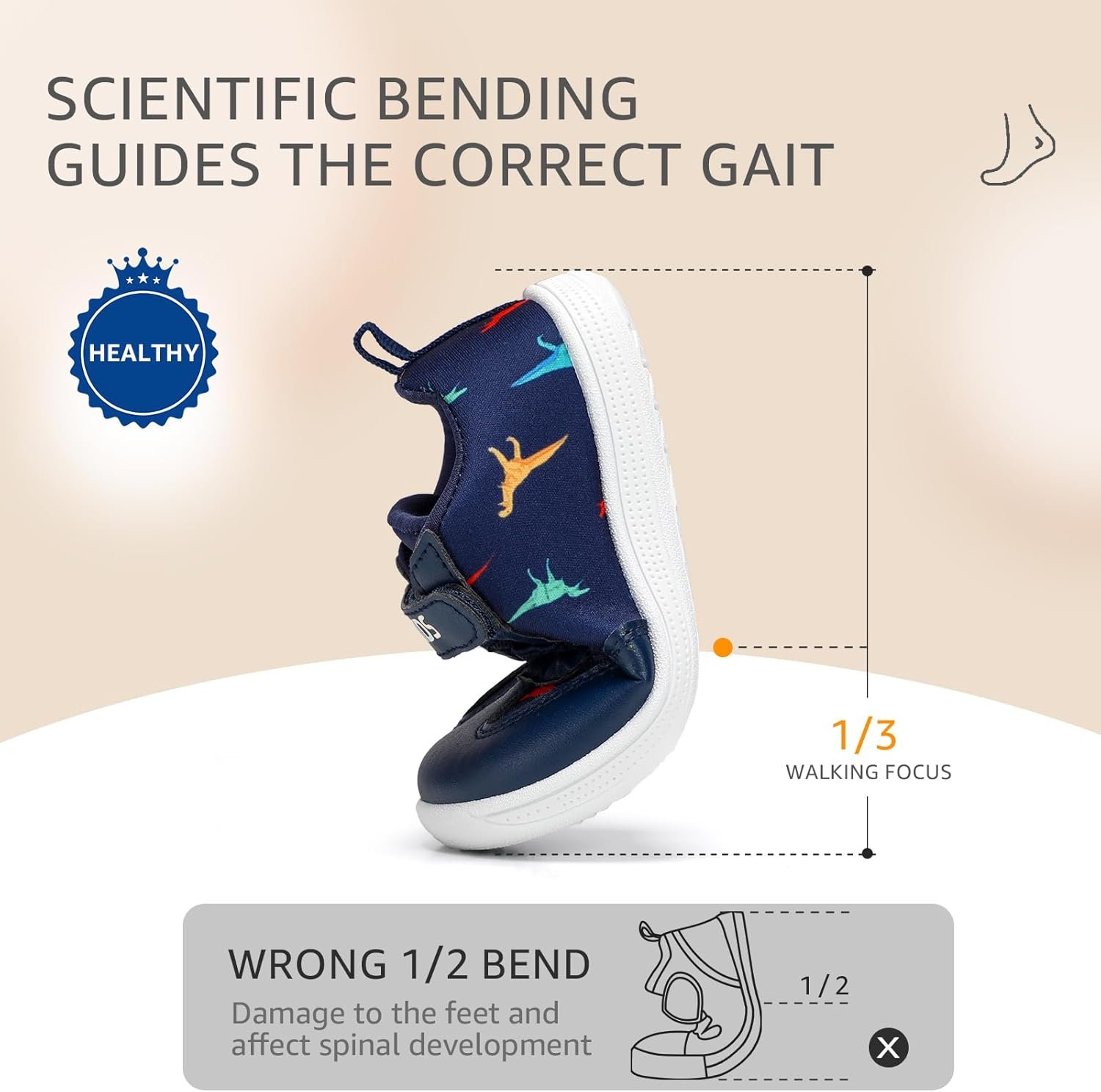 Customers find these toddler shoes comfortable and easy to put on, with a nice wide toe box that accommodates wide feet. They appreciate the design, with one customer specifically mentioning the dinosaur pattern, and find them flexible and good value for money. The durability receives mixed feedback – while some find them durable, others report straps ripping on the first day of use.