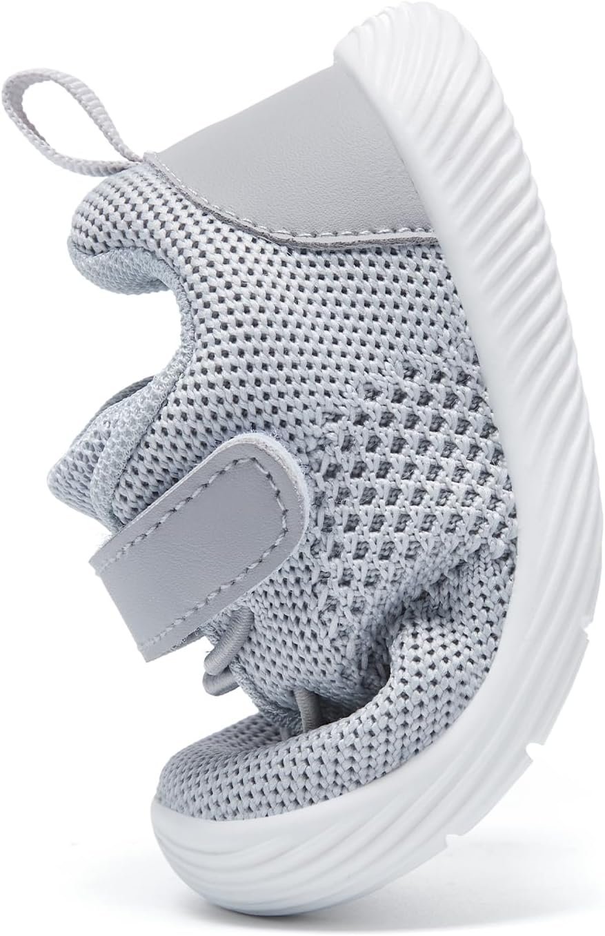 Customers find these toddler shoes to be amazing for early walkers, with a very wide toe box that accommodates wide feet. They are easy to slip on and go, and one customer mentions they took no time for their child to adjust to wearing them. The shoes are flexible, comfortable, and lightweight, with one customer noting they don’t pinch at all. They are durable, lasting months of daily wear, and customers appreciate their style, with one mentioning they look like real sneakers.