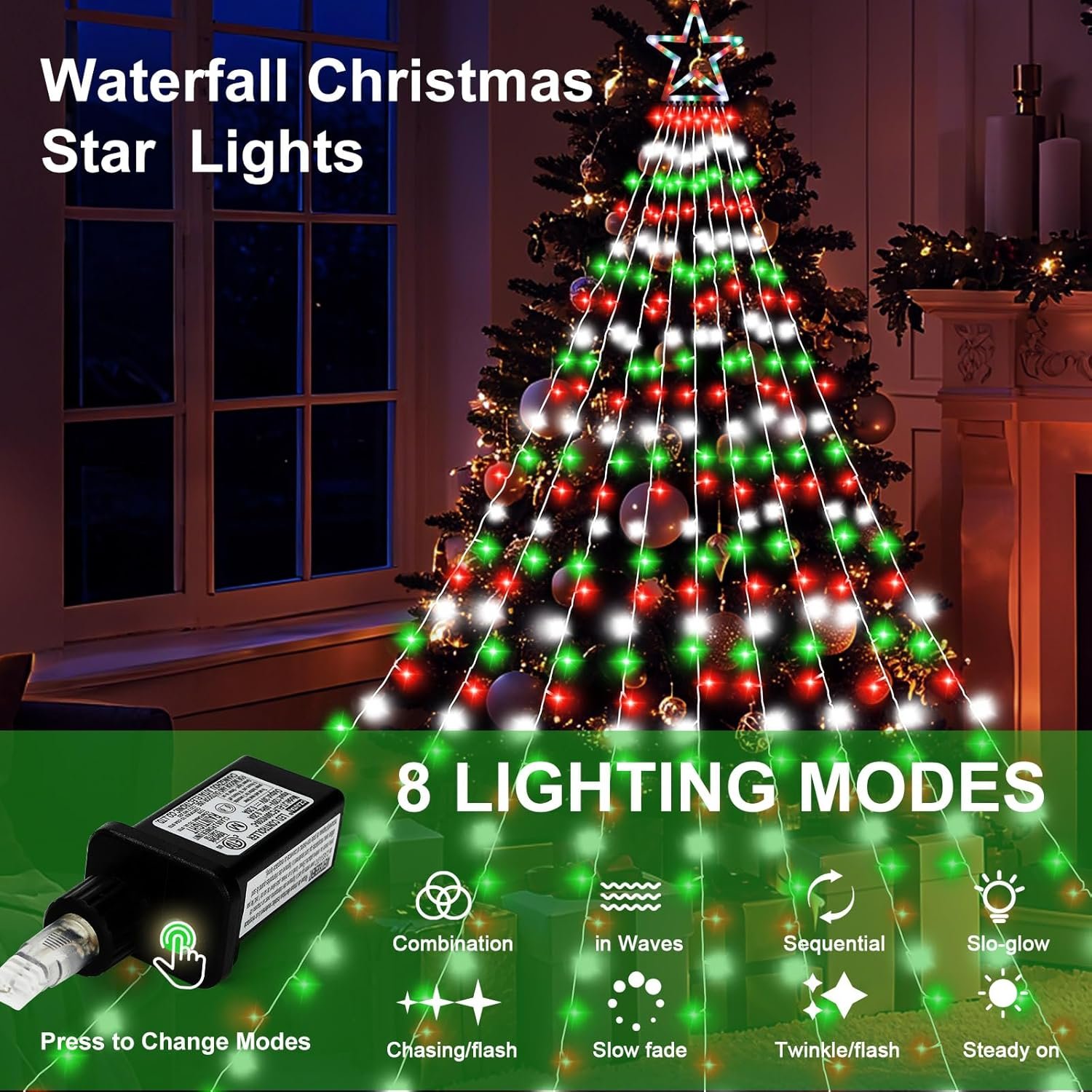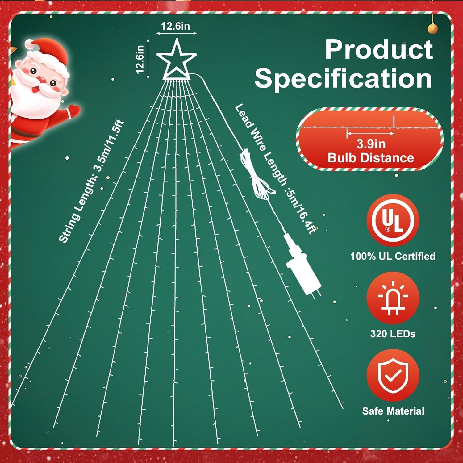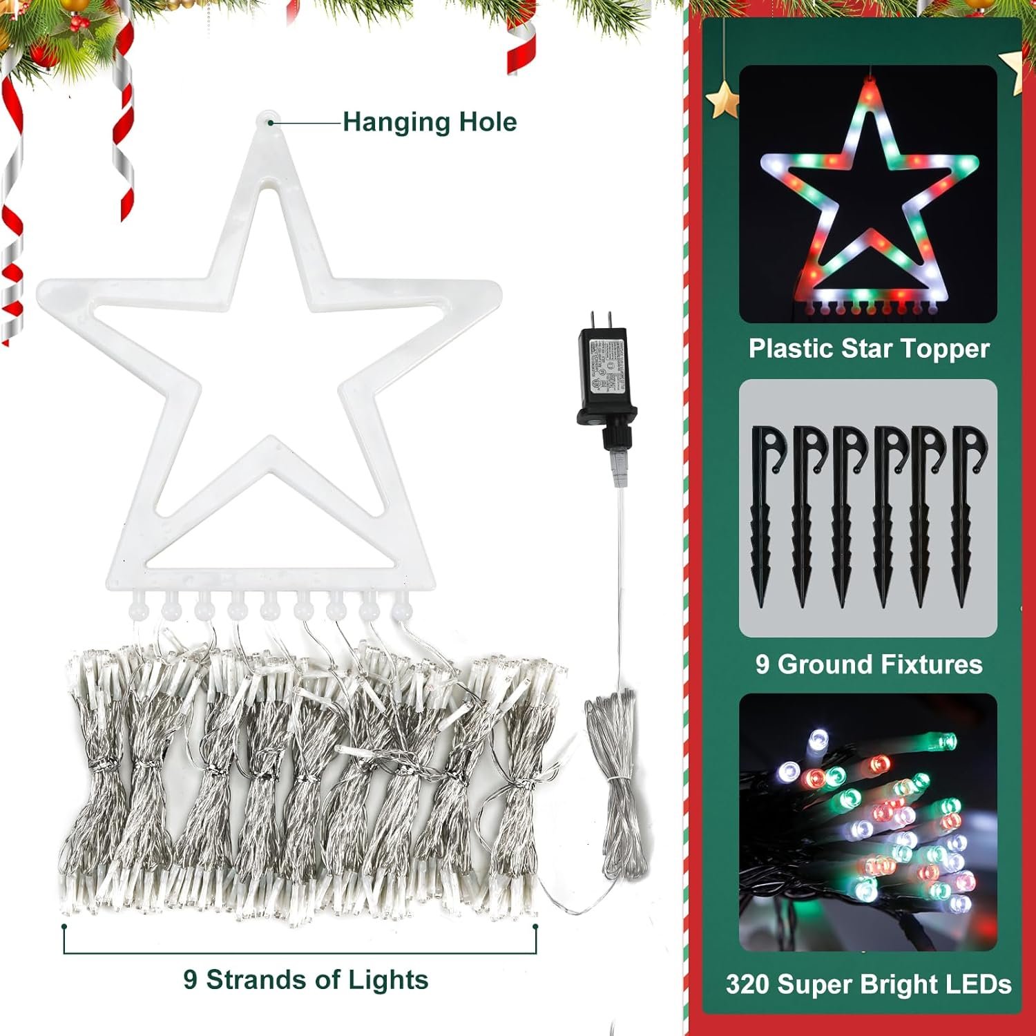 Specification LED Quantity: 320 LED Light color: Red White Green 8 Lighting Modes Srings Quantity: 9 Strands Size: Star Topper 12.6″ , lead cable16.4ft Power source: Plug-in Waterproof Grade: IP44