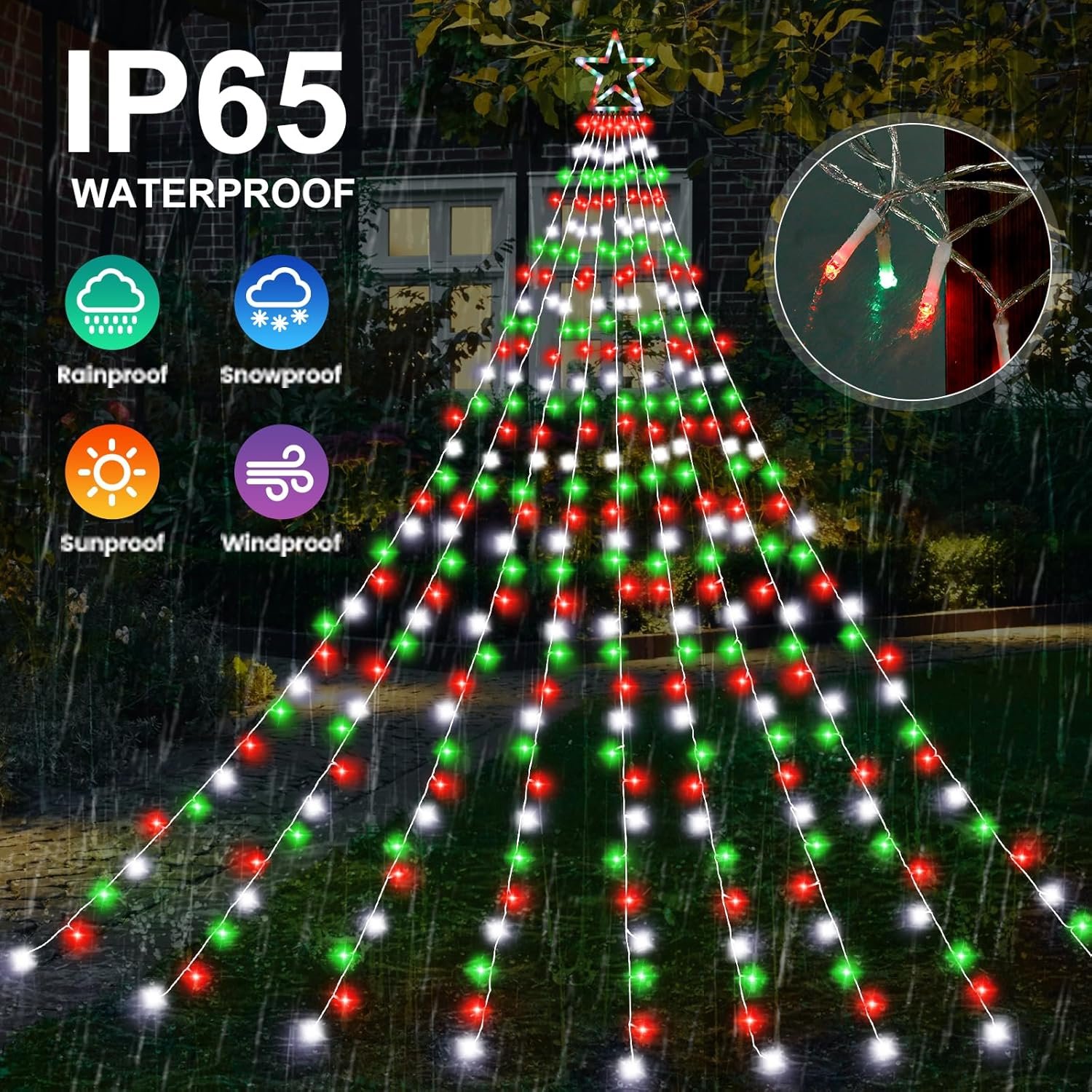 ★【8 Lighting Modes & Waterproof】 These falling star Christmas lights have 8 different light patterns to choose from: combination, in waves, sequential, slo-glo, chasing/flash, slow fade, twinkle/flash, and steady on. IP44 Waterproof Outdoor LED Tree Star Lights are the ideal choice for home and indoor/outdoor decoration. Please note: The plug is not waterproof.