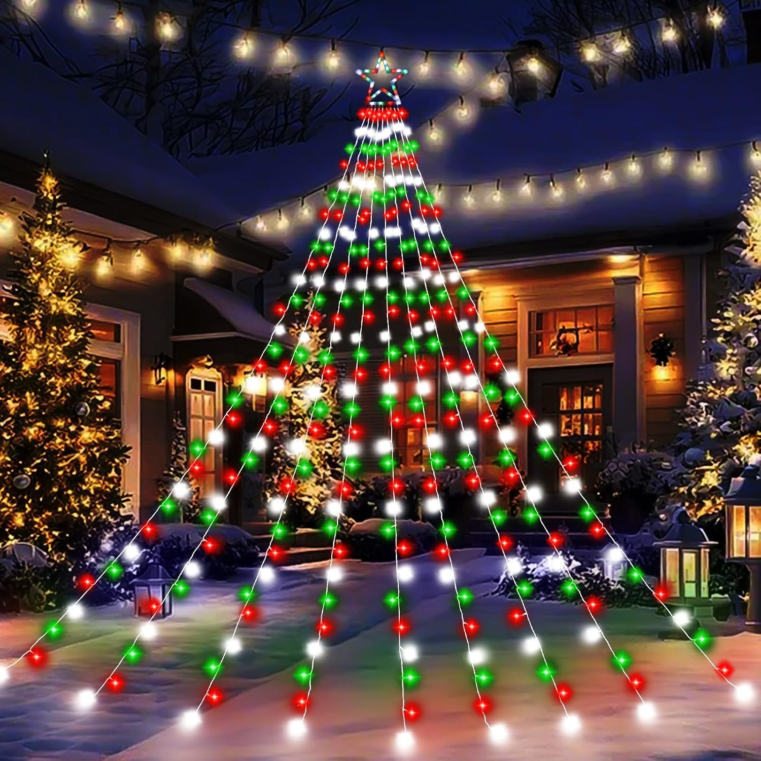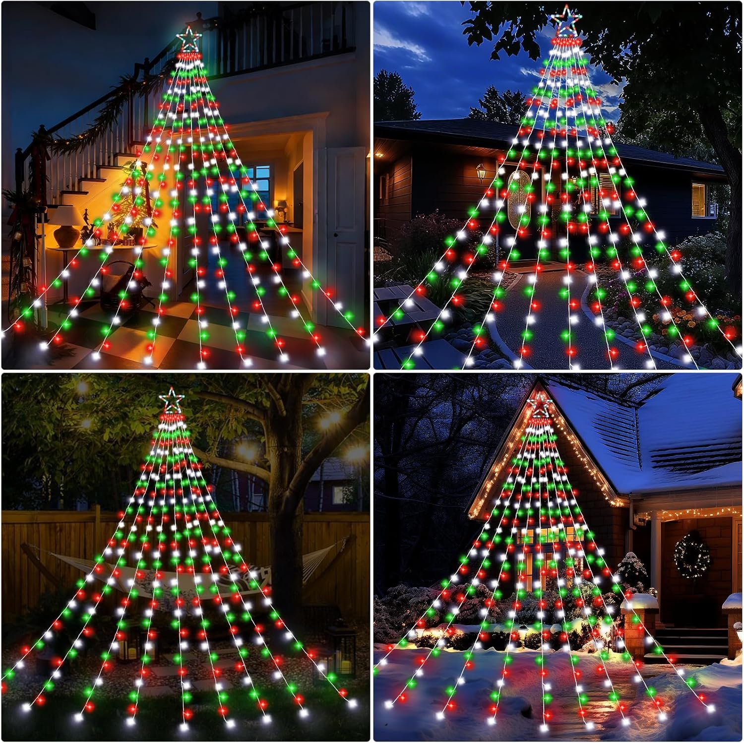 ★【Outdoor Christmas Decoration LightsLarge Christmas string lights are suitable for trees ranging from 8 to 13 feet tall. You can also hang the lights to decorate rooms, walls, and windows—simply mount the large star ornament on an exterior wall at approximately 10 feet high, then let 9 strands of lights cascade down to the ground. Alternatively, hang them sideways to create a shooting star effect, adding dazzling highlights to your home or outdoor decor.
