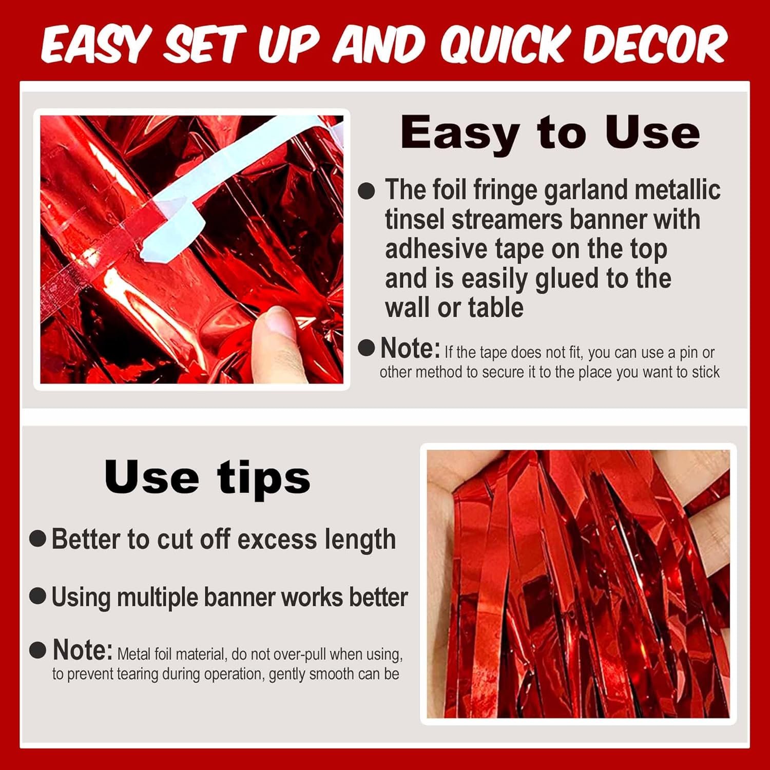 2. Please do not stick the tinsel foil fringe streamers garland on uneven or stained walls to prevent it from falling off!