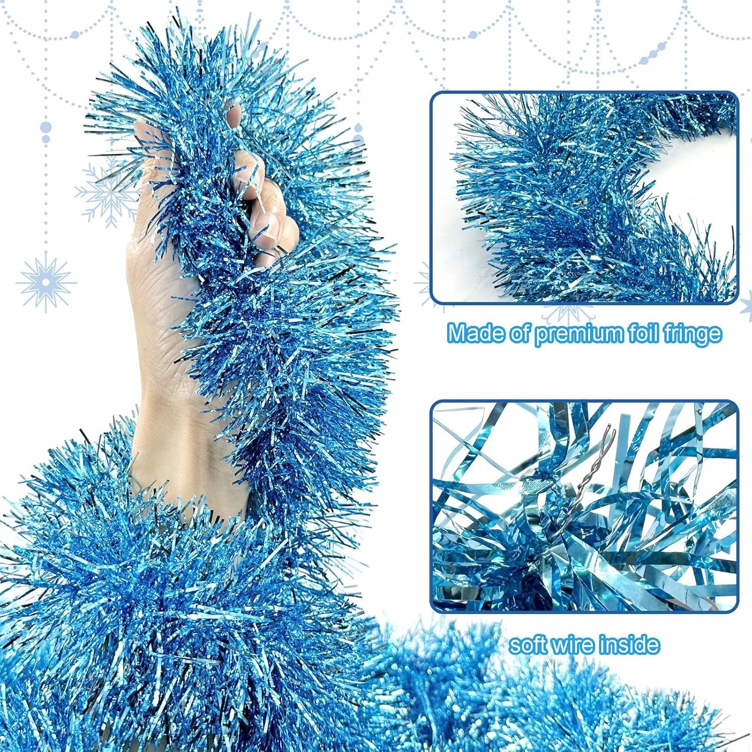 Enough length and thickness to meet your needs for home decorations.Shiny tinsels show a bit of sparkle and shine under light to create a visually appealing effect.Reusable and lightweight for easy carry and storage.Easy to shape, Christmas tree tinsel garland are flexible enough to be bent, twisted into any shape like curve or loops.
