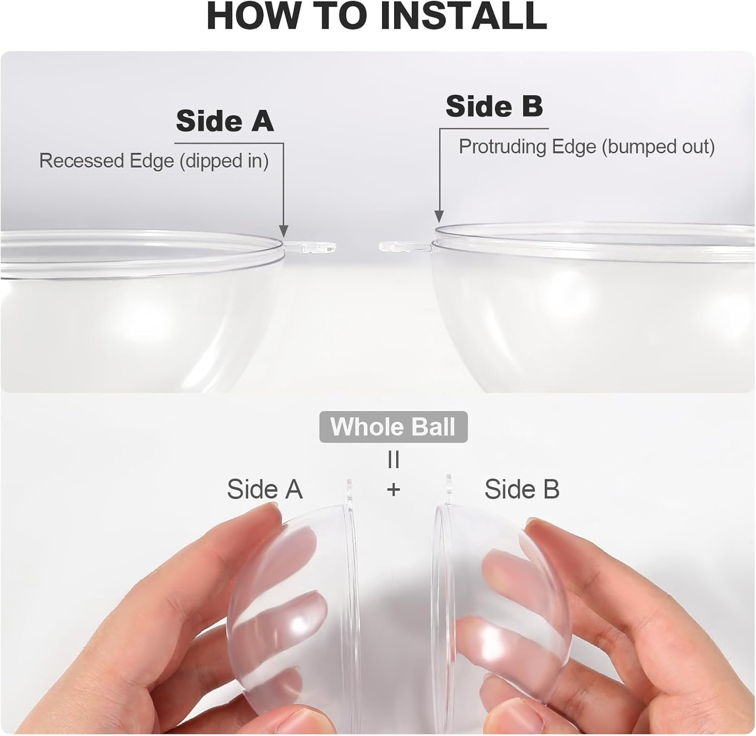 【Product Detail】: Made of two halves—Hemisphere A (curved edge) and Hemisphere B (smooth edge)—that snap together to form a complete transparent Christmas ball