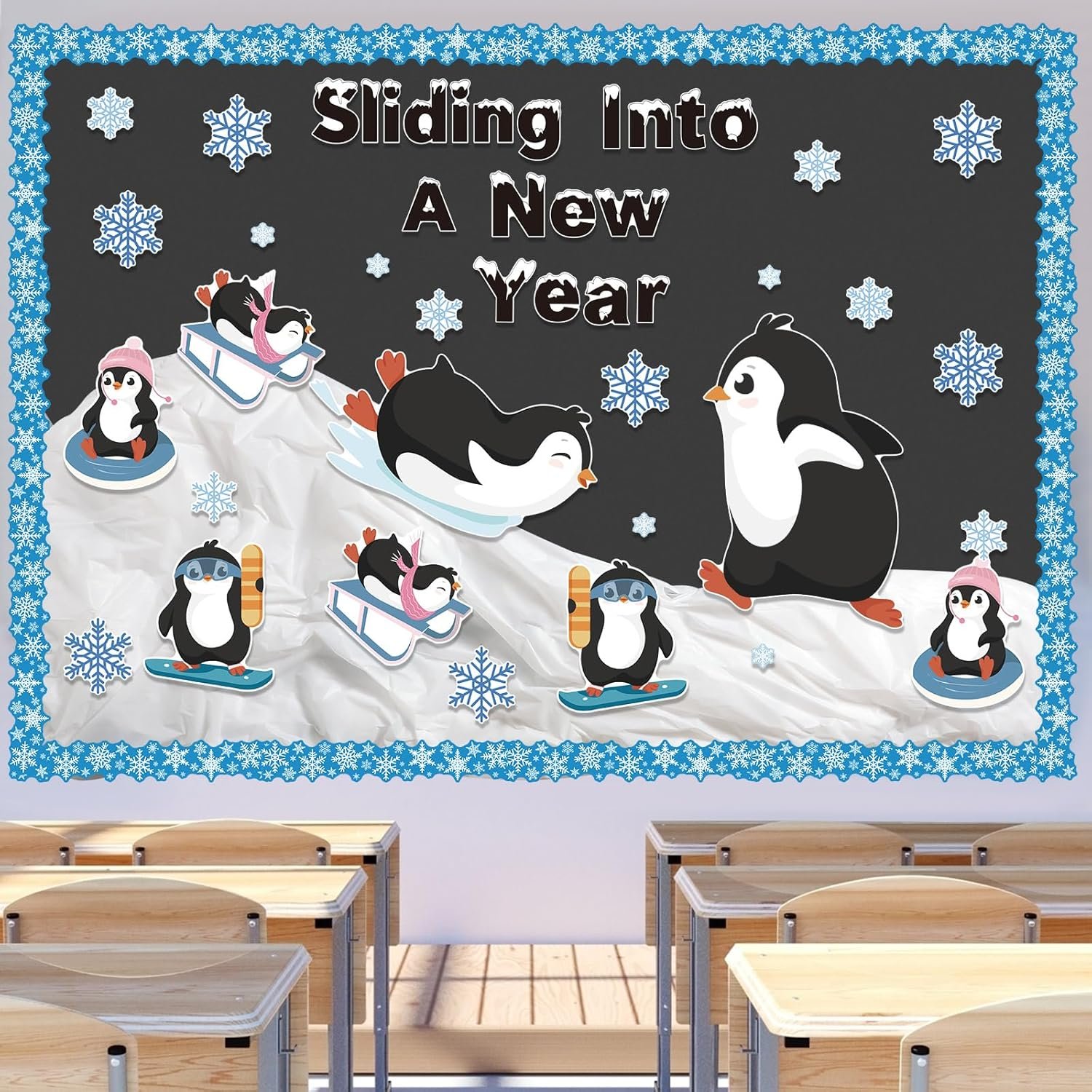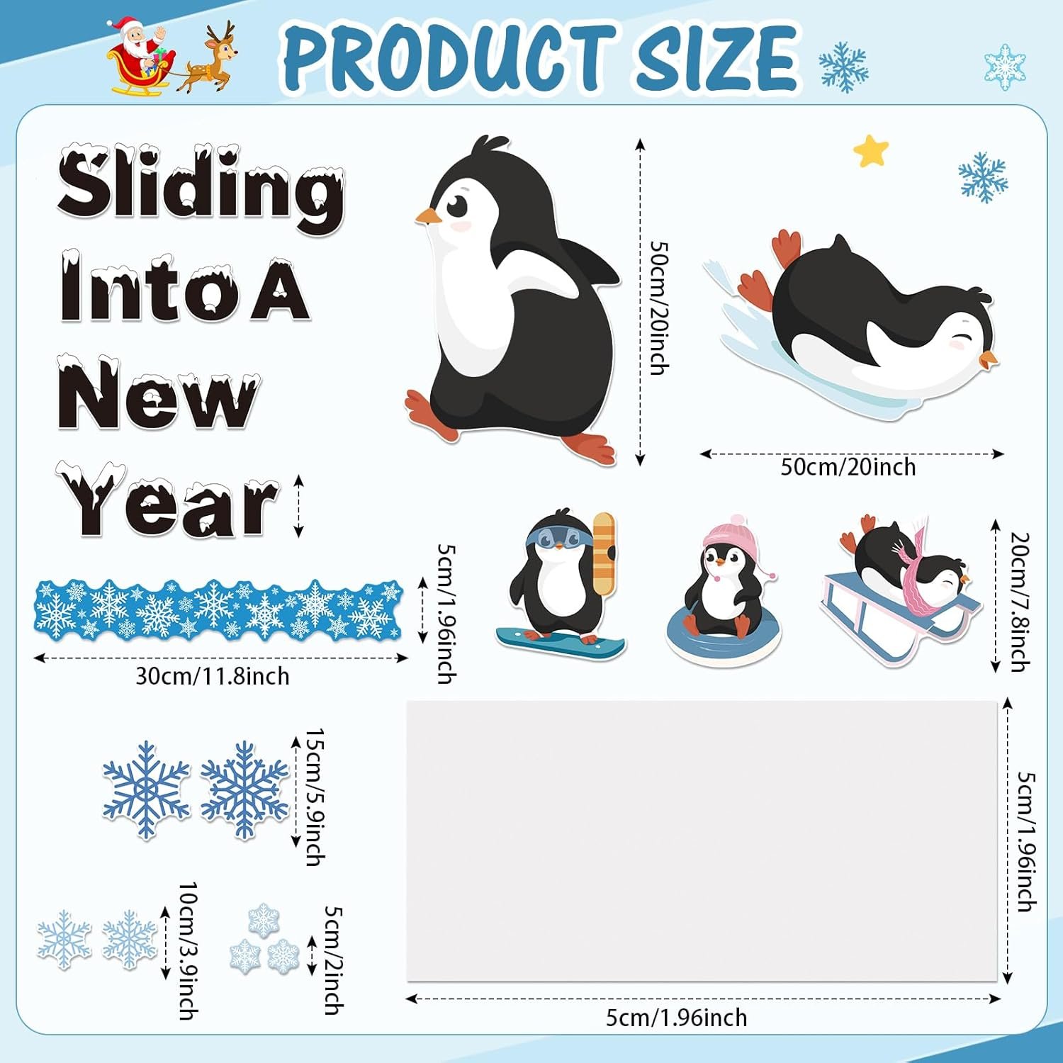 Package Include: you will get 66 pcs Christmas bulletin board decorations, including 19 pcs individual “SLIDING INTO A NEW YEAR” letter cards, 2 pcs large penguin cutouts, 9 pcs small penguin cutouts, 21 pcs snowflake cutouts, 15 pcs border, and 100 pcs glue points; Plus 1 piece of white plastic sheet can be used to DIY snow