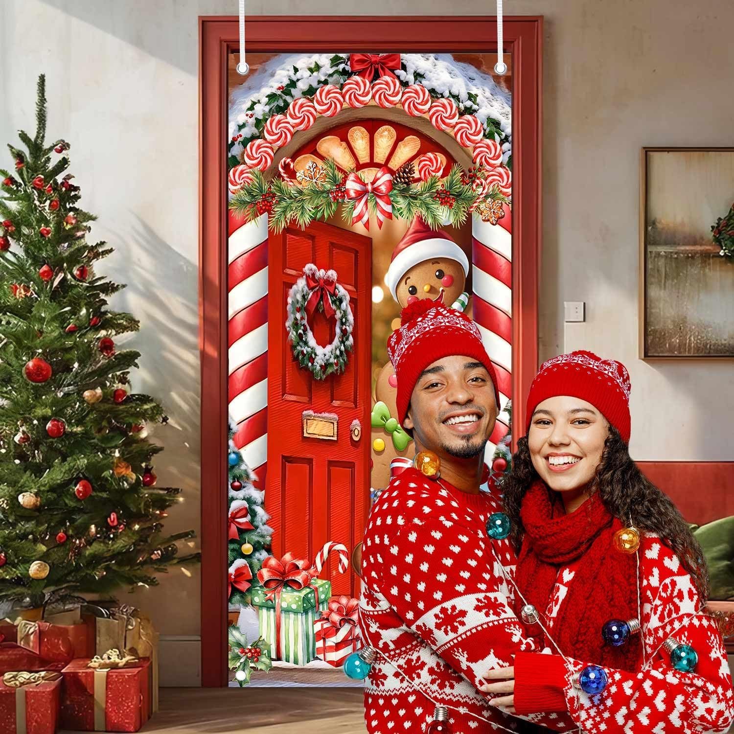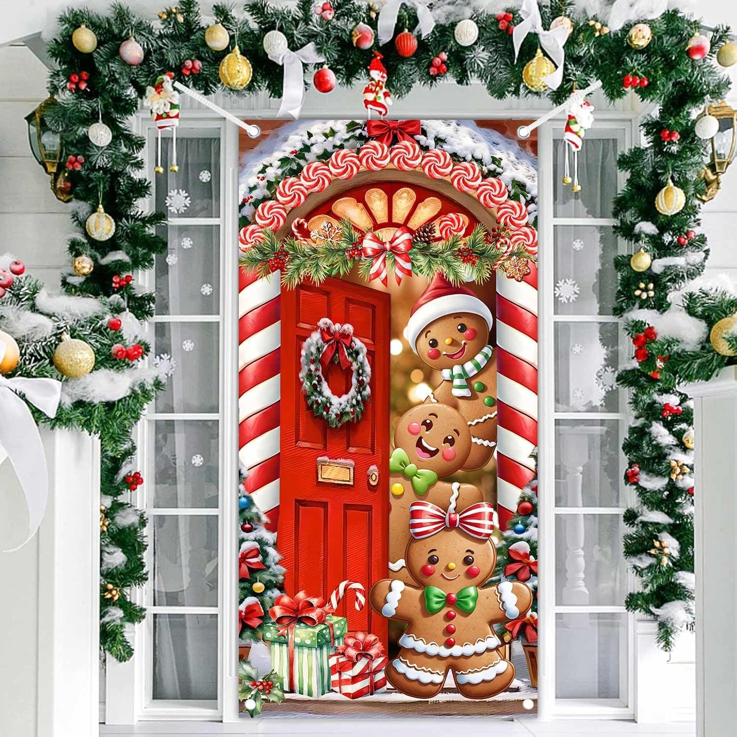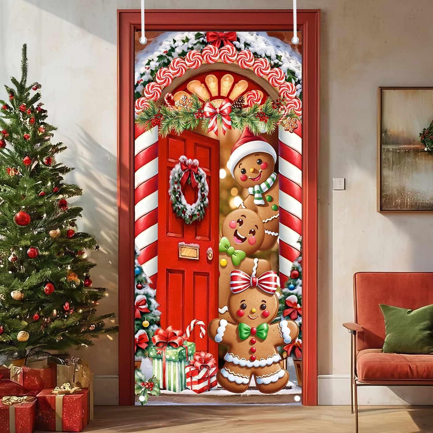 FESTIVE DESIGN: Vibrant Christmas door cover featuring adorable gingerbread characters, candy canes, wreaths, and holiday decorations in a charming doorway scene