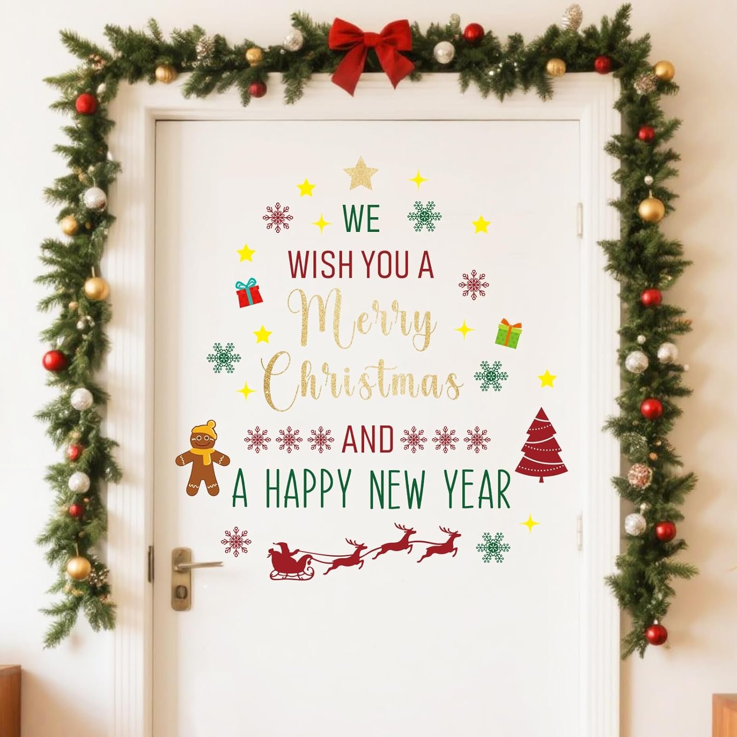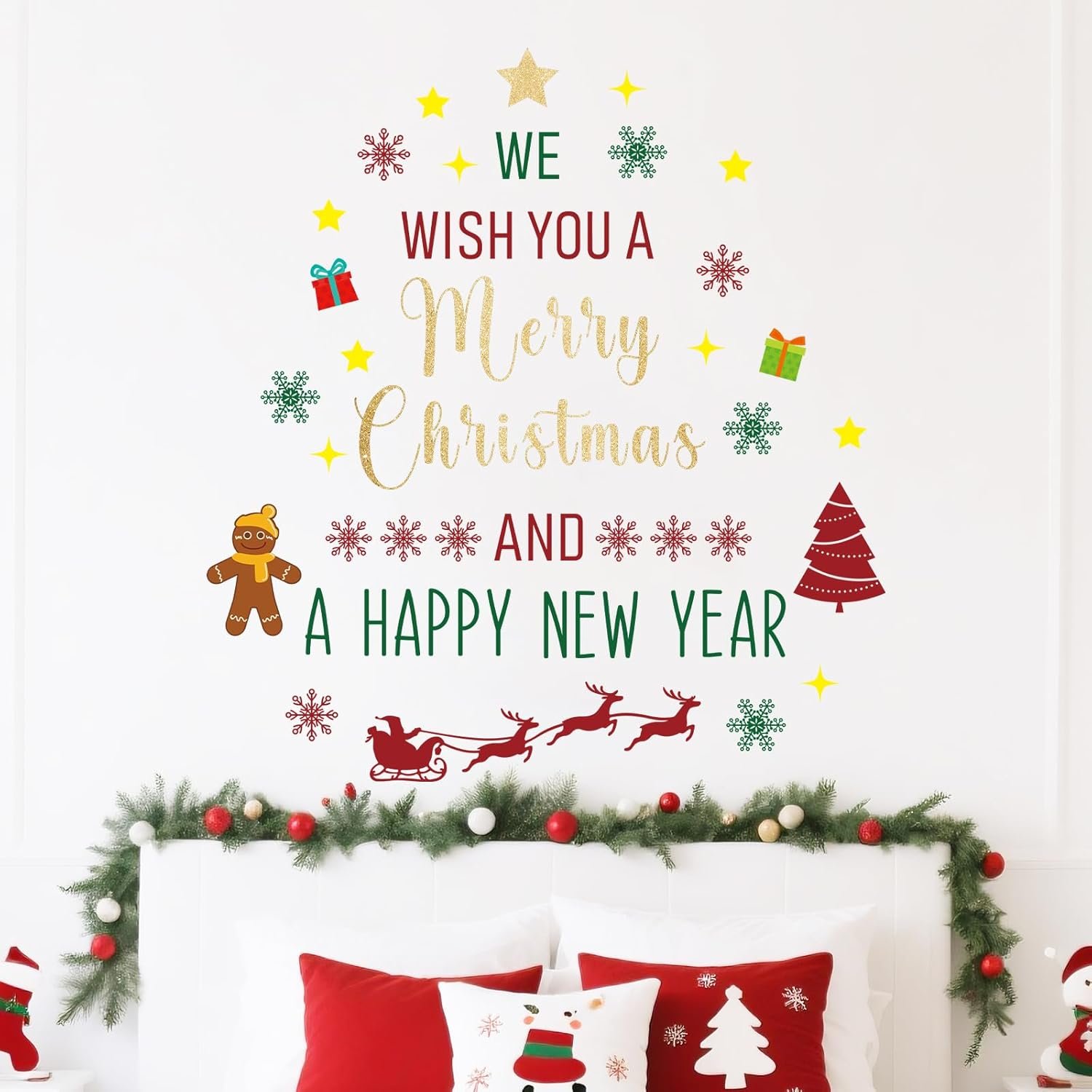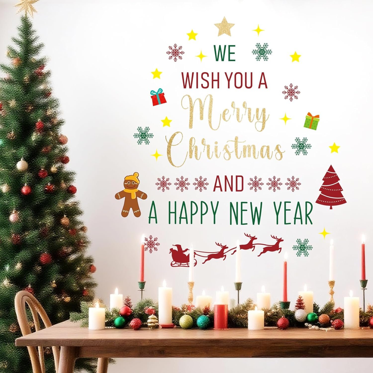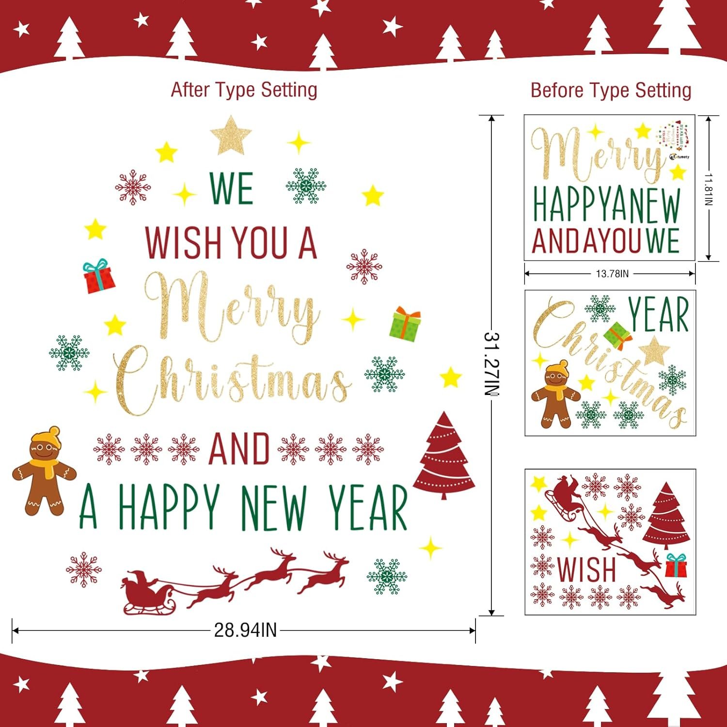 Lovely Christmas Wall Decor: Package includes 3 sheets Christmas themed wall stickers total of 36 words/patterns. The complete inspirational sayings quotes ‘WE WISH YOU A Merry Christmas AND A HAPPY NEW YEAR’. Christmas tree-shaped design adds classic and unique Xmas touch. Remaining patterns contain stars, snowflake, Christmas tree, gingerbread, gift boxes and reindeer pulling Santa sleigh.