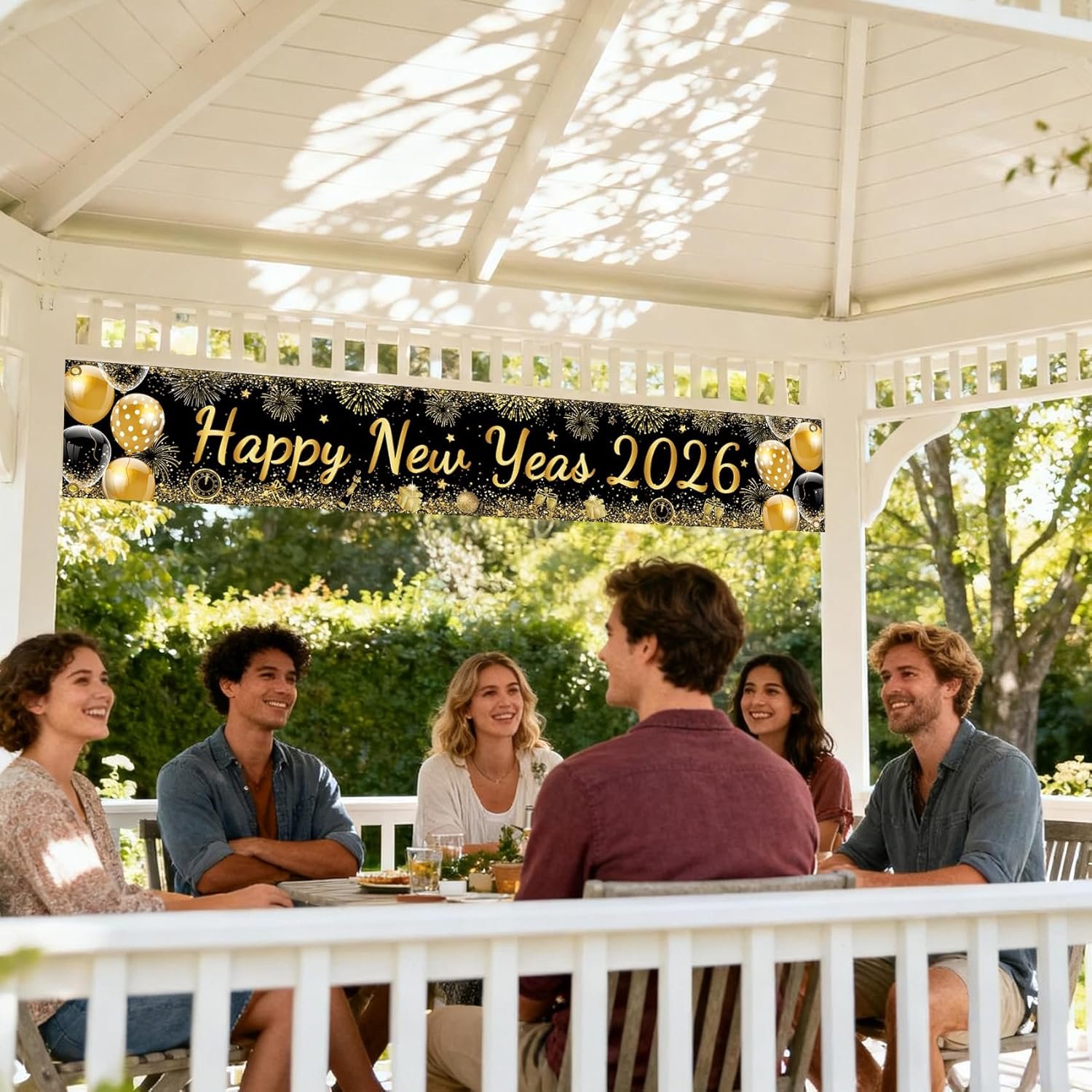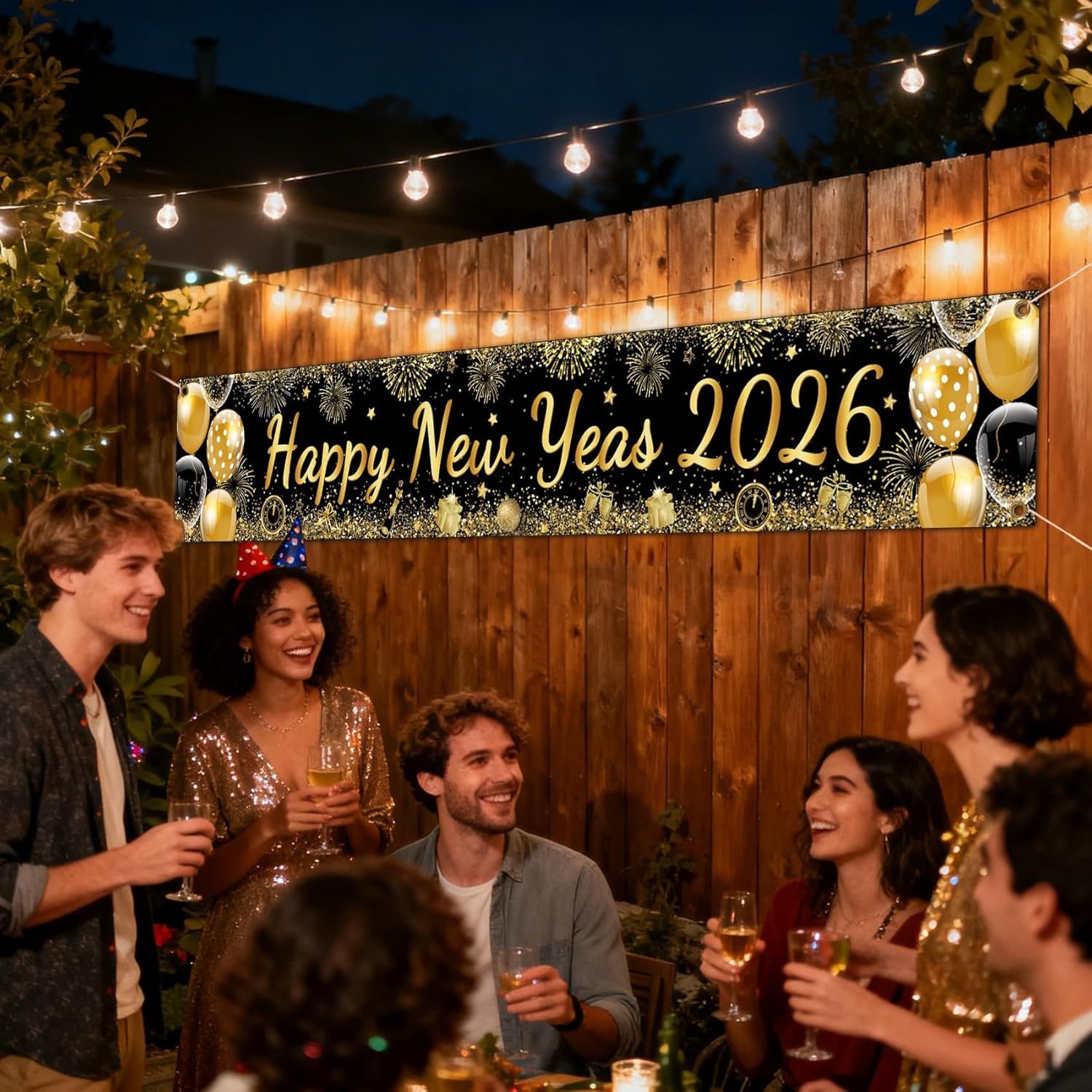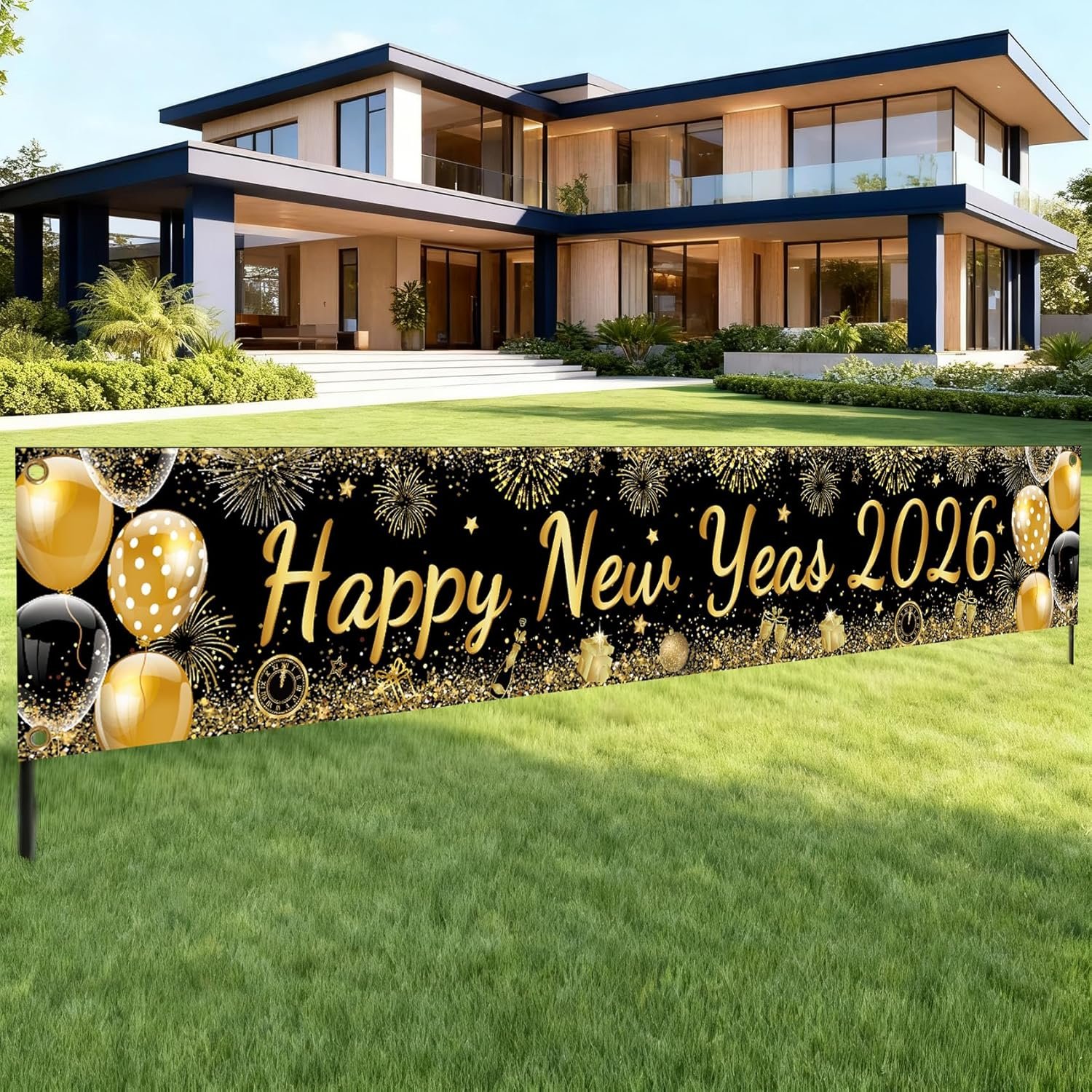 Packaging: You will receive a black and gold decorated “Happy New Year 2026” banner, approximately 20×120 inches in size