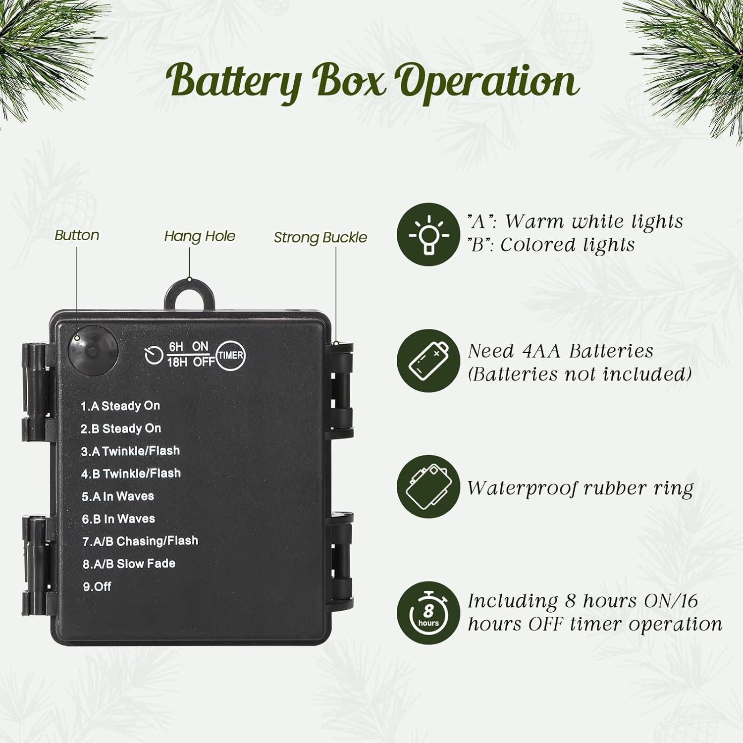 【Battery Operated & Timer Design】With a 4AA battery box design, the simplified battery box eliminates the need for a plug-in outlet, allowing you to place the tree anywhere. This charming artificial mini Christmas tree adds a festive atmosphere. It offers timer mode:6H ON&18H OFF.