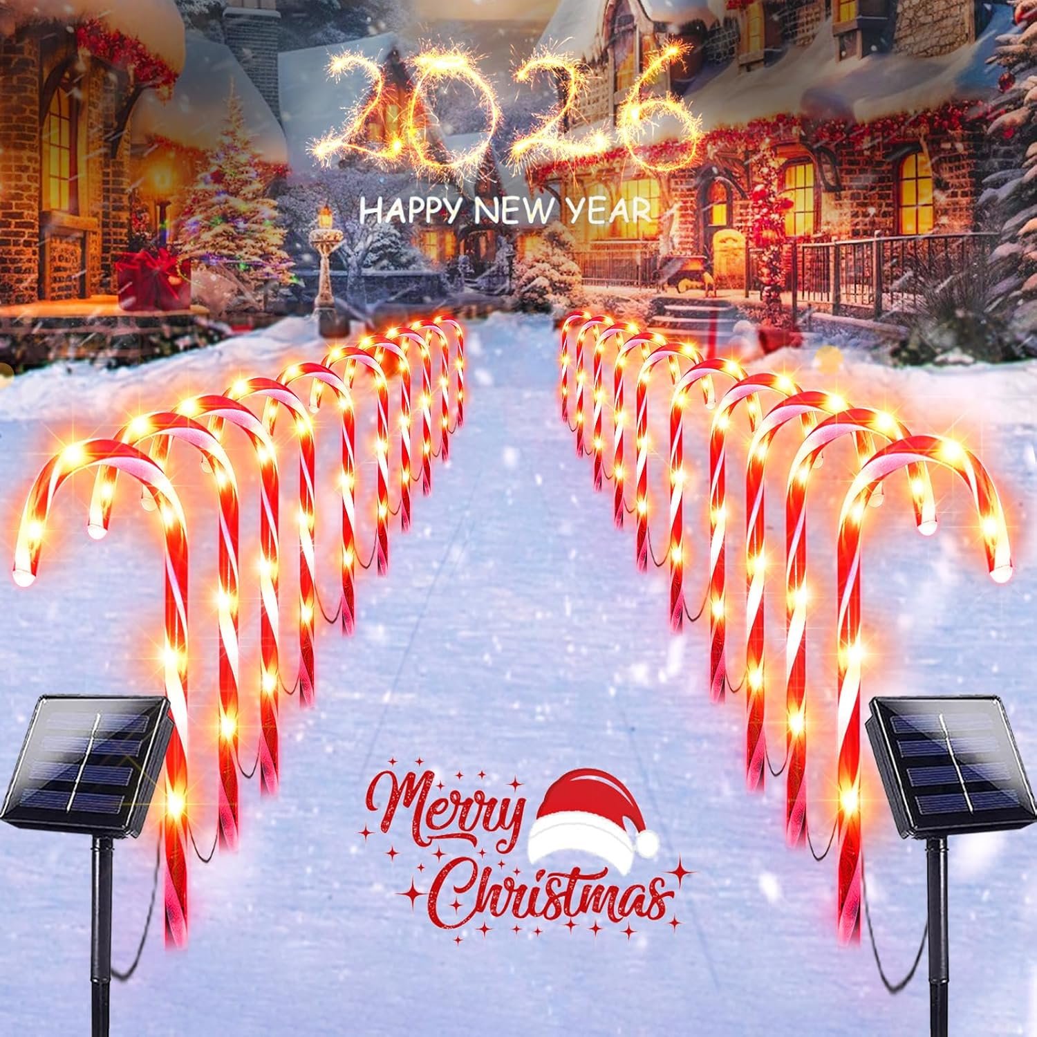 Energy Efficient and Auto ON/OFF: The Christmas pathway lights are powered entirely by the sun. No need pay for extra electricity bills. Just turn on the switch button on the back of the solar panel. With built-in light sensor, the candy cane decorations turn on automatically at dusk and turns off at dawn. They can light up to 8-10 hours at night after a fully charge of 6-8 hours