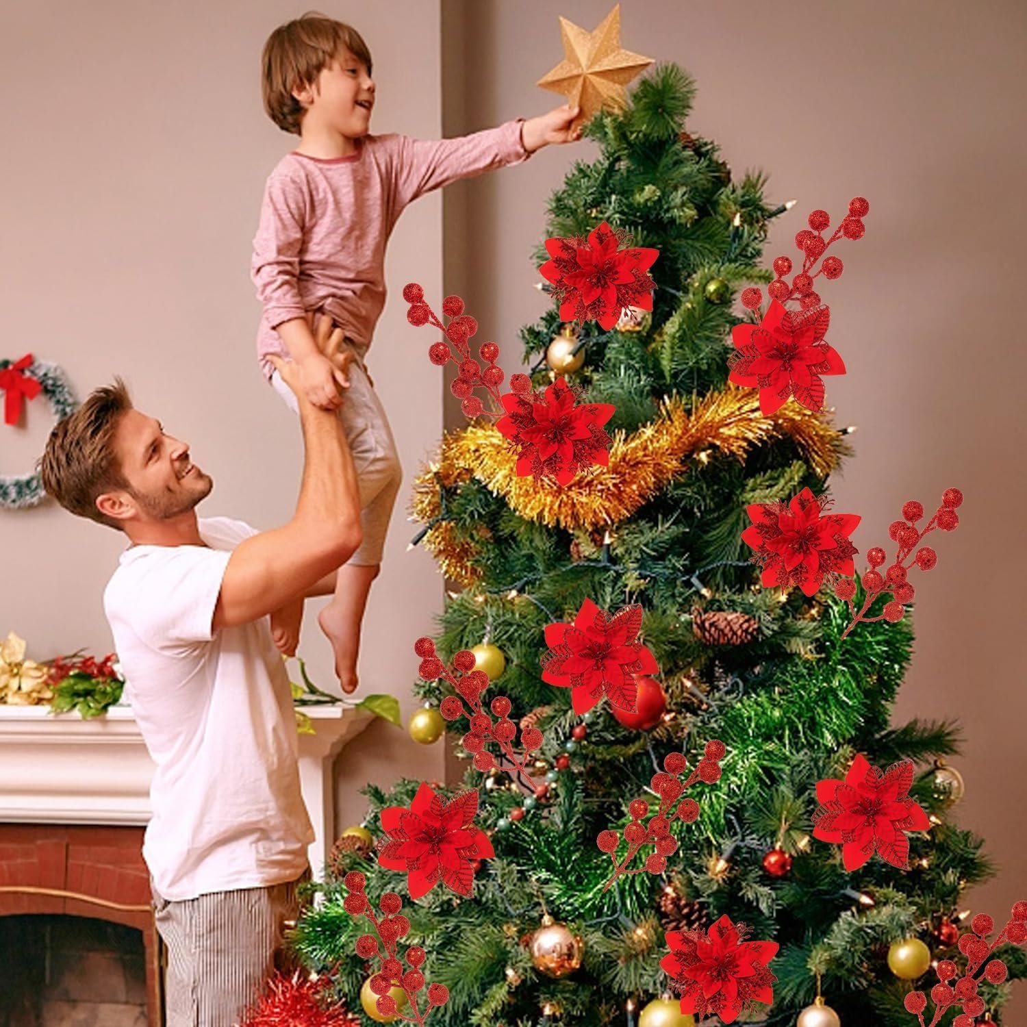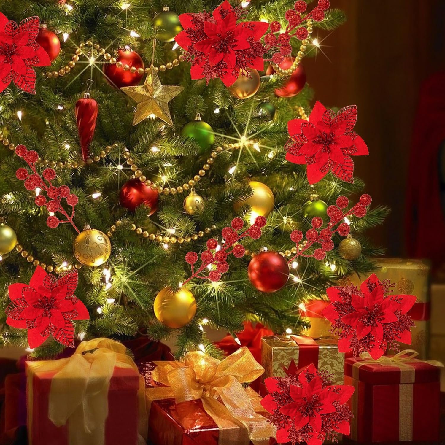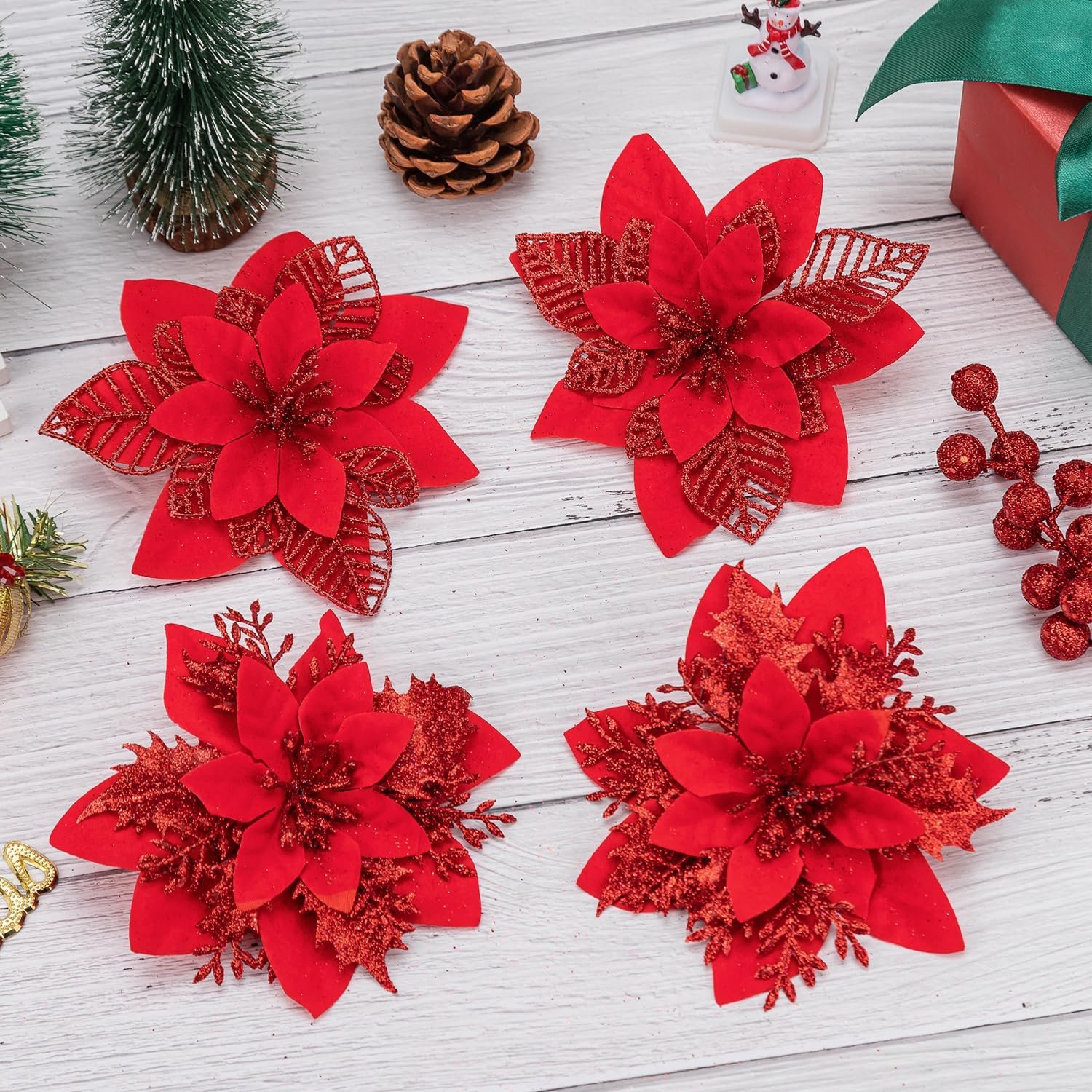 Christmas poinsettias: There are 24 pcs Christmas flowers set in each package, total 3 different styles including 8 5.5 inch new designed folwers, 8 5.5 inch glitter half-hollow flowers,and 8 7.8 inch glittery christmas tree picks, and comes with 16 metallic clips to meet your different decoration needs. Perfect for filling in bare spots of your Xmas tree which will increase the festival’s joyous atmosphere, and really giving it an overall pretty look.