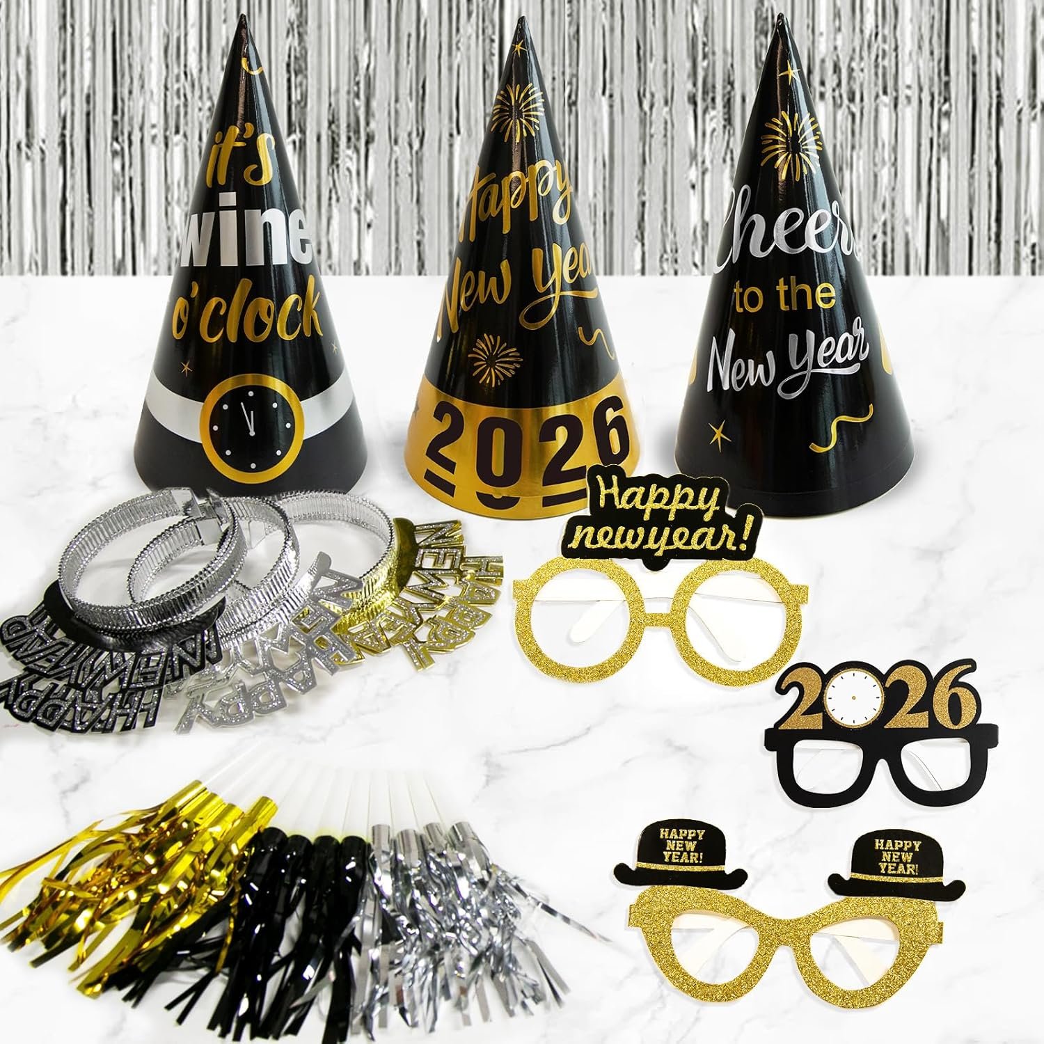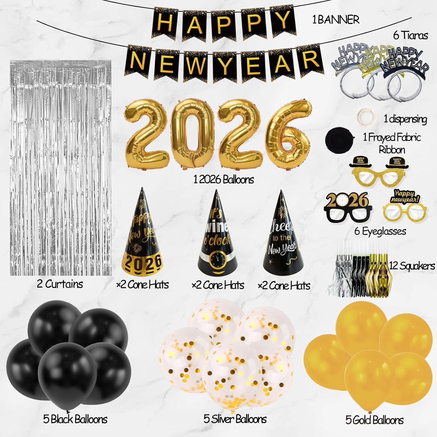 Includes 50 pieces: happy new year banners, 2026 number balloons, 1 black ribbon for balloons, 5 white balloons with gold confetti, 10 foil balloons (5 black, 5 gold), 6 hats, 6 glasses, 6 tiaras, 12 squawkers and 2 fringe curtains.