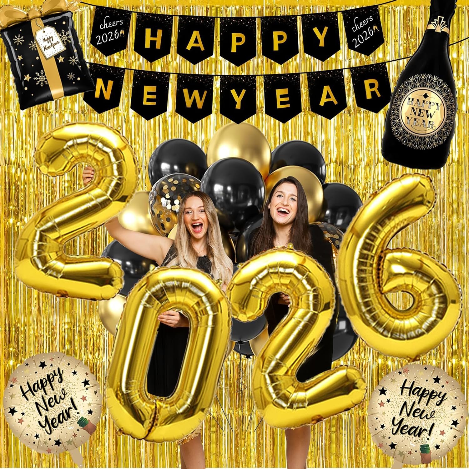 Elevate Your Celebration: Prepare for an unforgettable new years eve bash with our all-inclusive 2026 new years eve party supplies! This complete kit caters to up to 12 guests, featuring 6 hats, 6 glasses, 10 party squawkers Blowers , 6 tiaras, 2 champagne-shaped balloons, 2 star-shaped balloons, 2 fringe curtain, a set of “2026” balloons, a happy new year banner, and 30 assorted balloons. Everything you need for a dazzling celebration is neatly packed in one box.