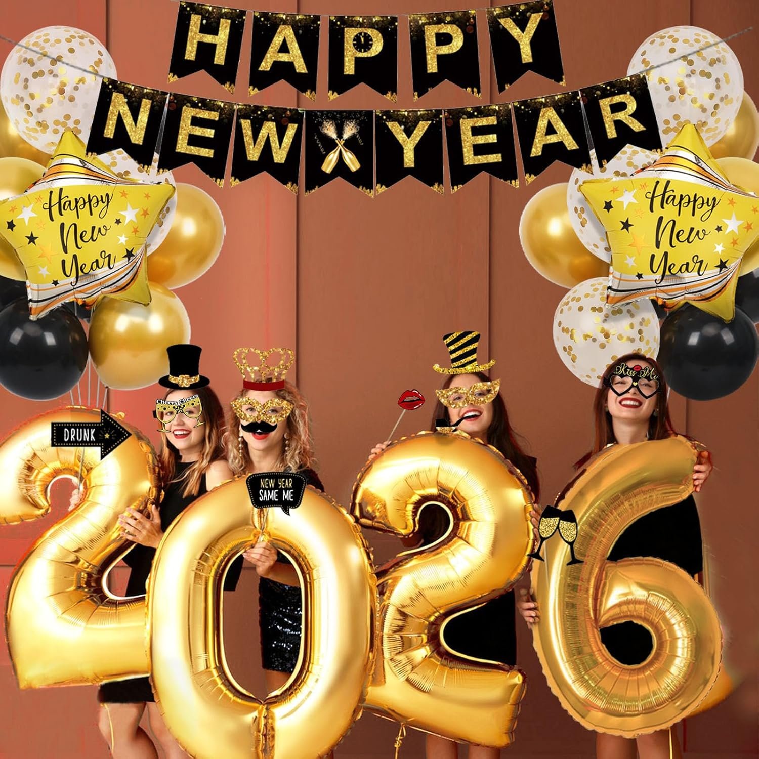 2026 Happy New Years Decorations Set: 1 x gold and black”HAPPY NEW YEAR” bannner, 2 pcs 18 inch golden pentagram new year aluminum foil balloons, 4 pcs 32 inch gold numbers 2026 new year balloons, 8 pcs new years eve party supplies glasses, 22 pcs 2026 new year photography props, 6 pcs 12 inch metal gold balloons, 6 pcs 12 inch black balloons, 6 pcs 12 inch golden confetti balloons, A golden ribbon and a black ribbon. We assure you that this stunning new years eve party supplies 2026 will bring you smile and joy on your new years decorations.