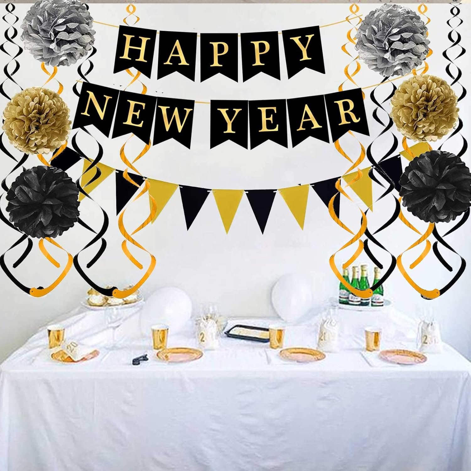 Color: Happy new year banner is black and Gold;Pom poms ball is Black Gold Grey; Triangle flag is Gold Black; Streamer is Gold Black.This is a classic timeless color scheme that makes your new year party even more luxurious and atmospheric.