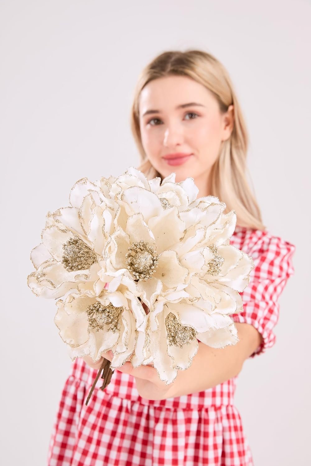 Customers find these artificial flowers beautiful and appreciate their quality, size, and value for money. They work well as Christmas tree decorations, with one customer noting they’re perfect on a 7.5′ tree. The color receives mixed feedback, with one customer noting the flowers are not gold as expected. Customers express concerns about the glitter quality, with one mentioning that too much tiny glitter falls off.