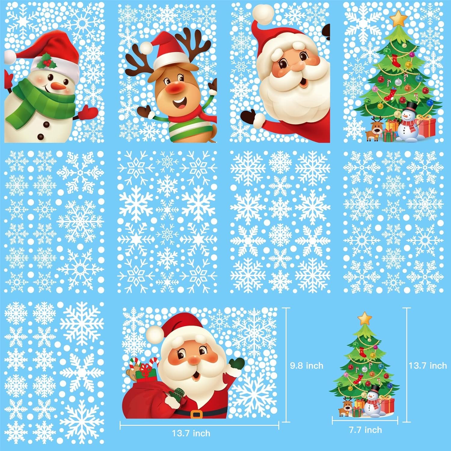 QUANTITY – 129 pcs snowflake window stickers flowers, 5 Christmas pattern stickers (2 Santa Claus, 1 snowman, 1 Xmas tree, 1 reindeer), and 400pcs+ white dots. 3 different sizes and 9 different designs on each sheet.