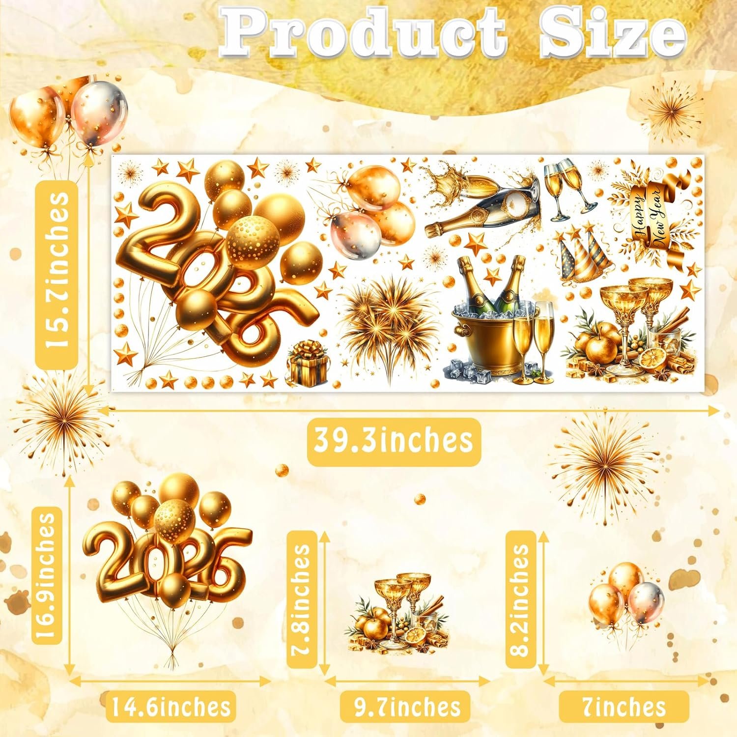 What You Will Get: Total 1 sheet,the size: 15.7 x 39.3 inches of New Year Window Clings,2026 sign with balloon pattern size: 16.9″H x 14.8″W,4 different champagne bottles,champagne bottles pattern size: 9″H x 8.2″W from 7.1″H x 3.6″W