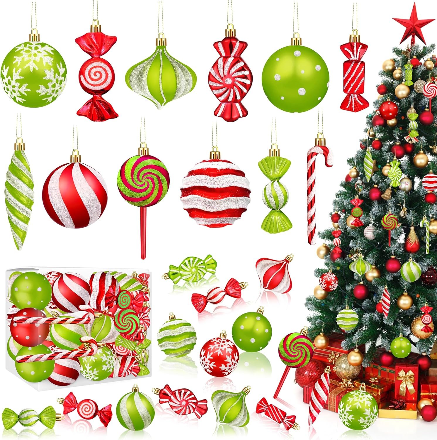 Quality Material: The shatterproof candy themed Christmas decorations are made of quality plastic, features unbreakable practicality. Set you free from worrying about them breaking and hurting kids and pets. Bright color and luster, can serve you for a long time.