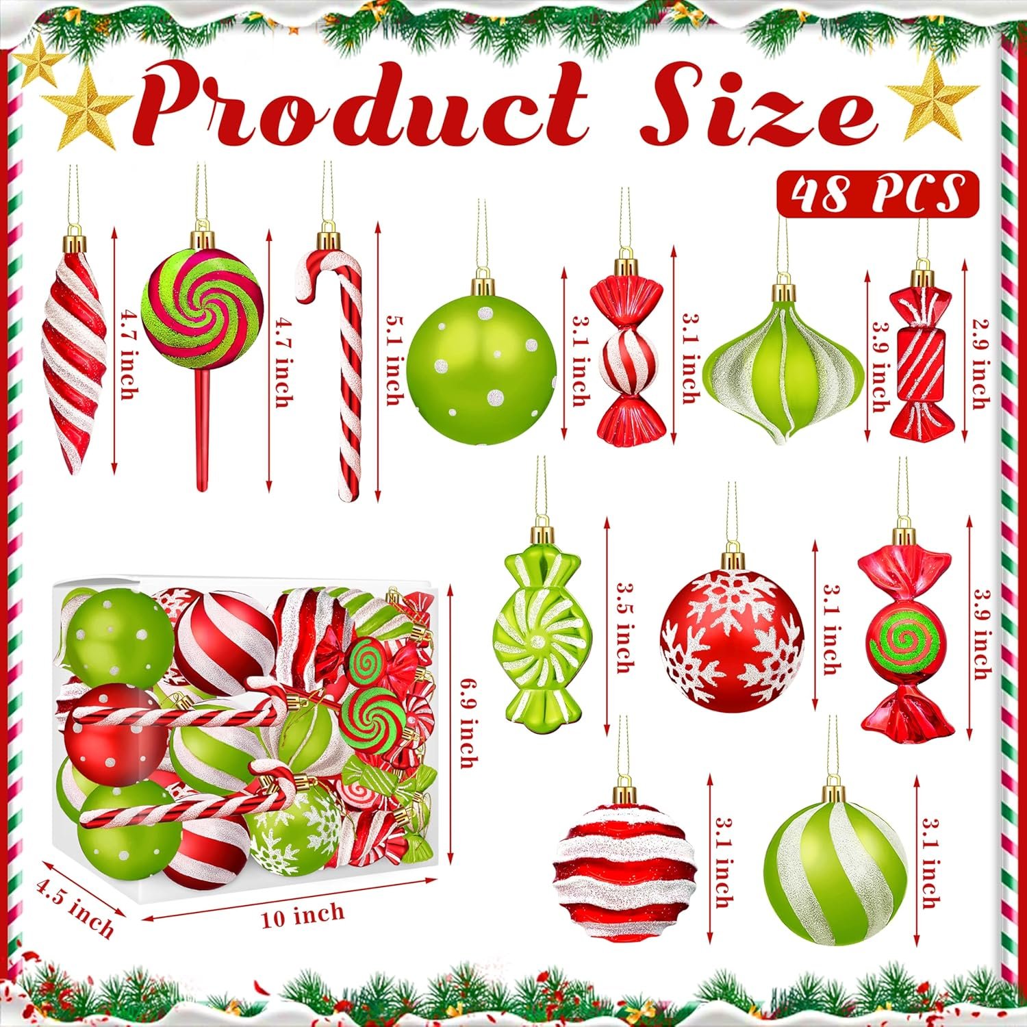 Candy Christmas Ornaments Kit: The package comes with 48 pieces plastic candy decorations, including 12 different styles, 4 pieces for each style, enough to meet your decorating needs.