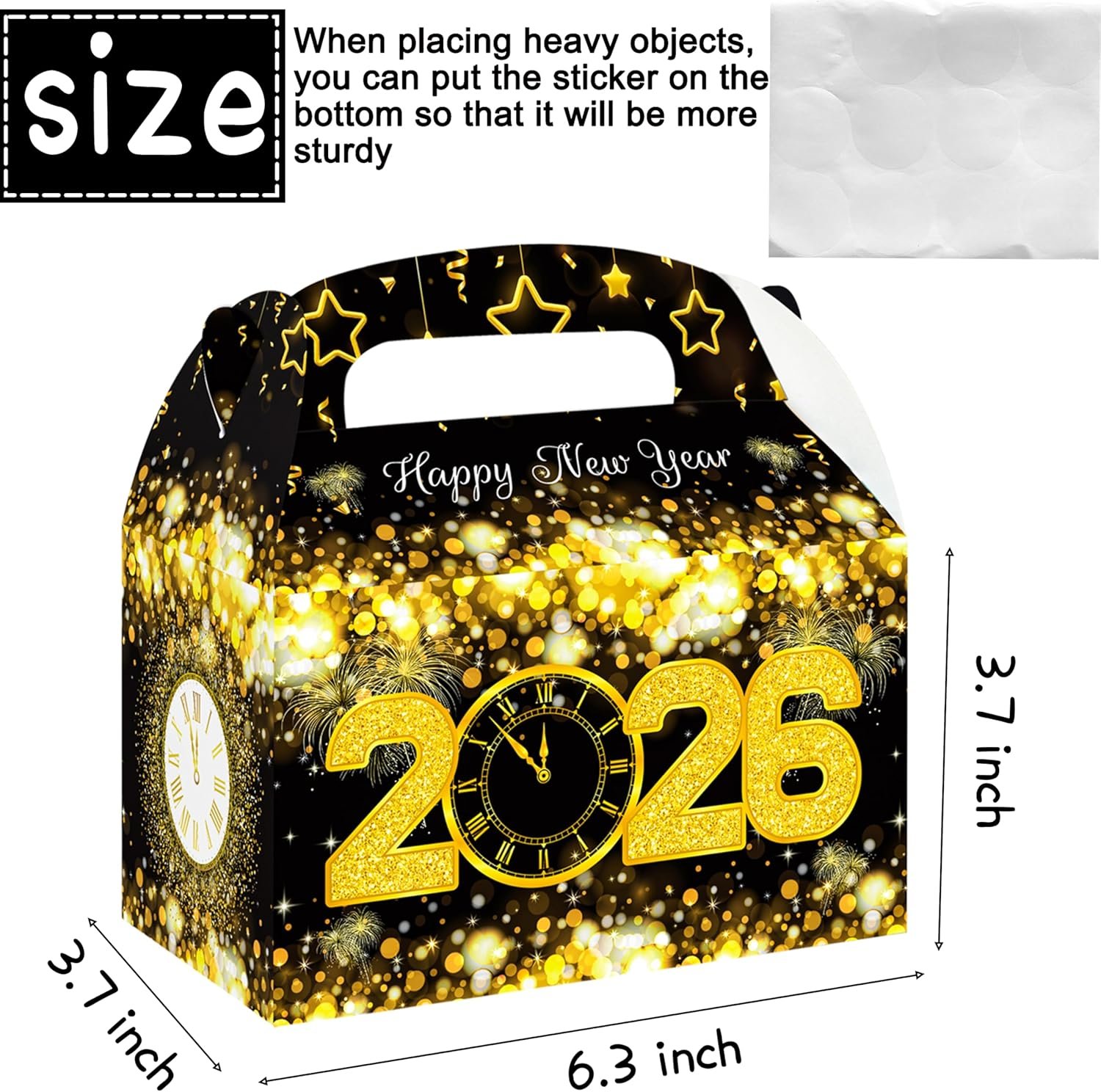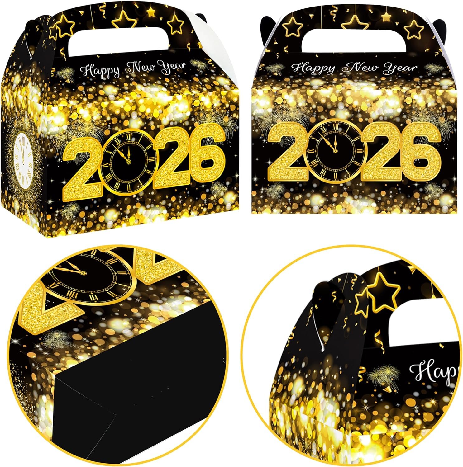 You will receive 12pcs new year treat boxes in 1 styles with 2 patterns front and back, each measures approximately 3.7 x 6.3 x 3.7 inches.The new year eve treat box is black as the background color, with gold happy New Year 2026 font and star pattern embellishment. Made of quality craft paper,durable and sturdy; full-color printing on both sides; the right size and the nice design,recyclable and safe for holding your delicious candies.Simple assembly required: ships flat; simply fold and connect pre-folded tabs to assemble.Perfect for happy new year party,new year eve party, community activities.