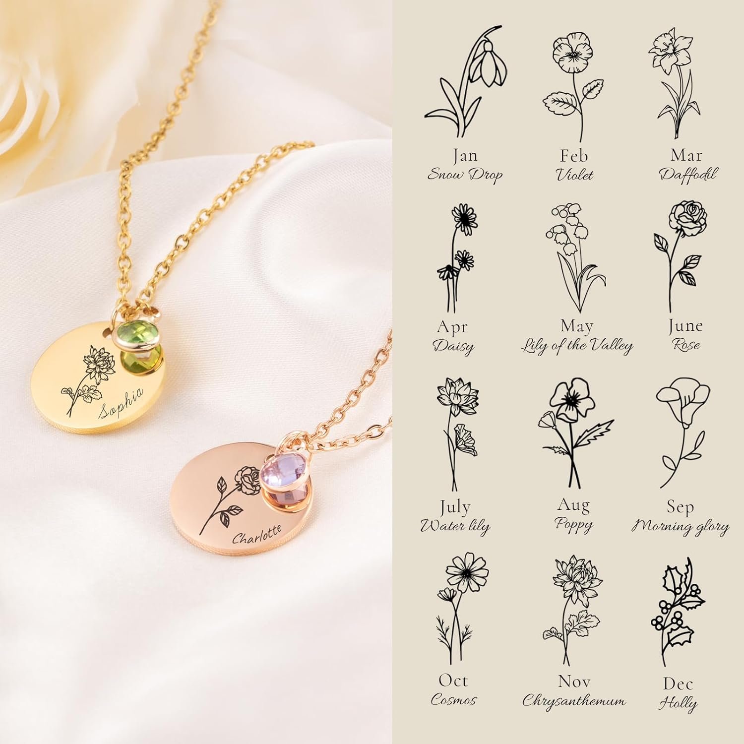 A Gift That Speaks from the Heart This personalized birth flower necklace is more than just jewelry—it’s a celebration of love, connection, and memory. Hand-engraved with her name, her birth month flower, and paired with a sparkling birthstone, it’s a truly meaningful piece. Whether you’re shopping for your mom, daughter, grandmother, or best friend, this necklace makes a heartfelt gift for birthdays, Mother’s Day, Christmas, or just because. With elegant gift-ready packaging, it’s ready to make her smile the moment she opens it.