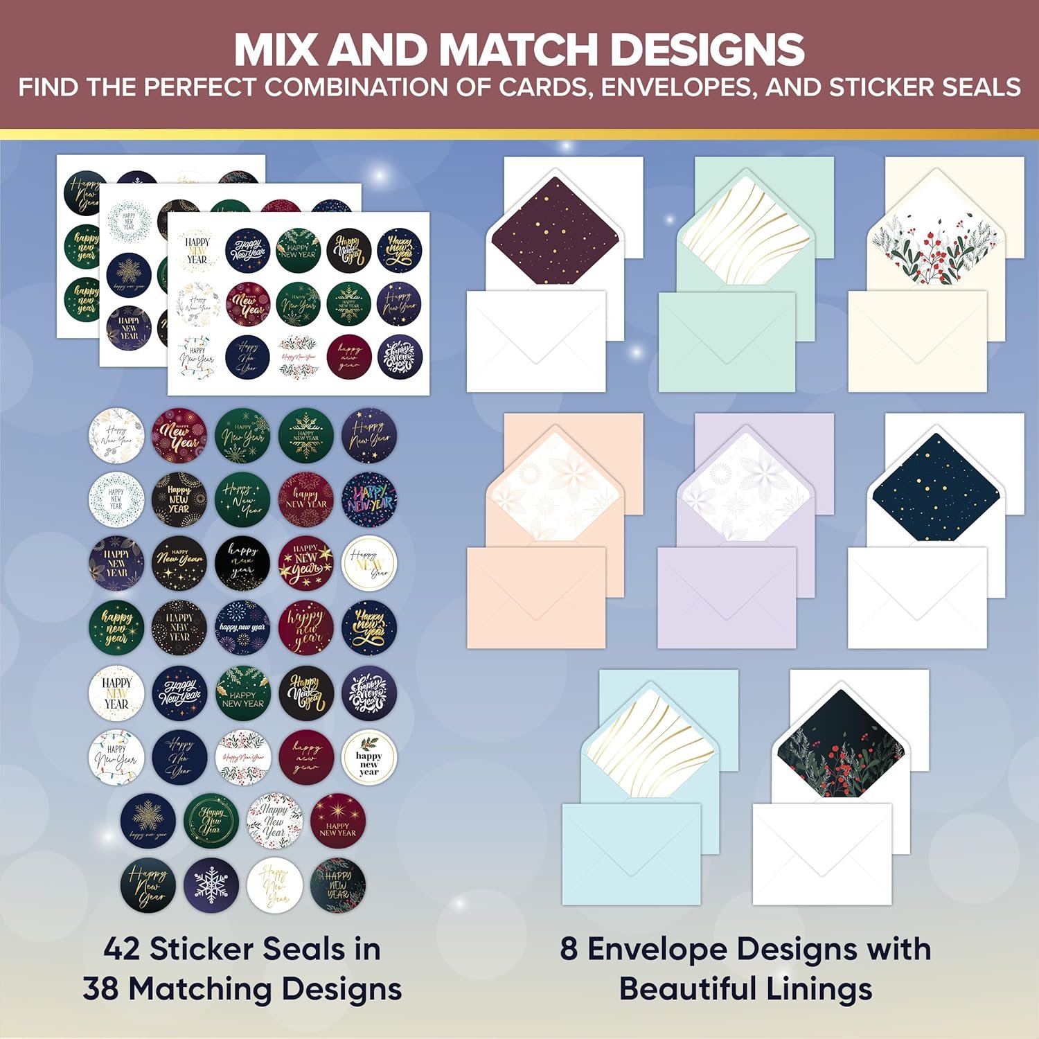 COMPLETE CARD SET – These happy new year greeting cards include 40 new years day cards with a mix of elegant foil accents & simple prints, 40 envelopes with pre-water soluble gum closures & printed linings in 8 designs, and 42 matching sticker seals.