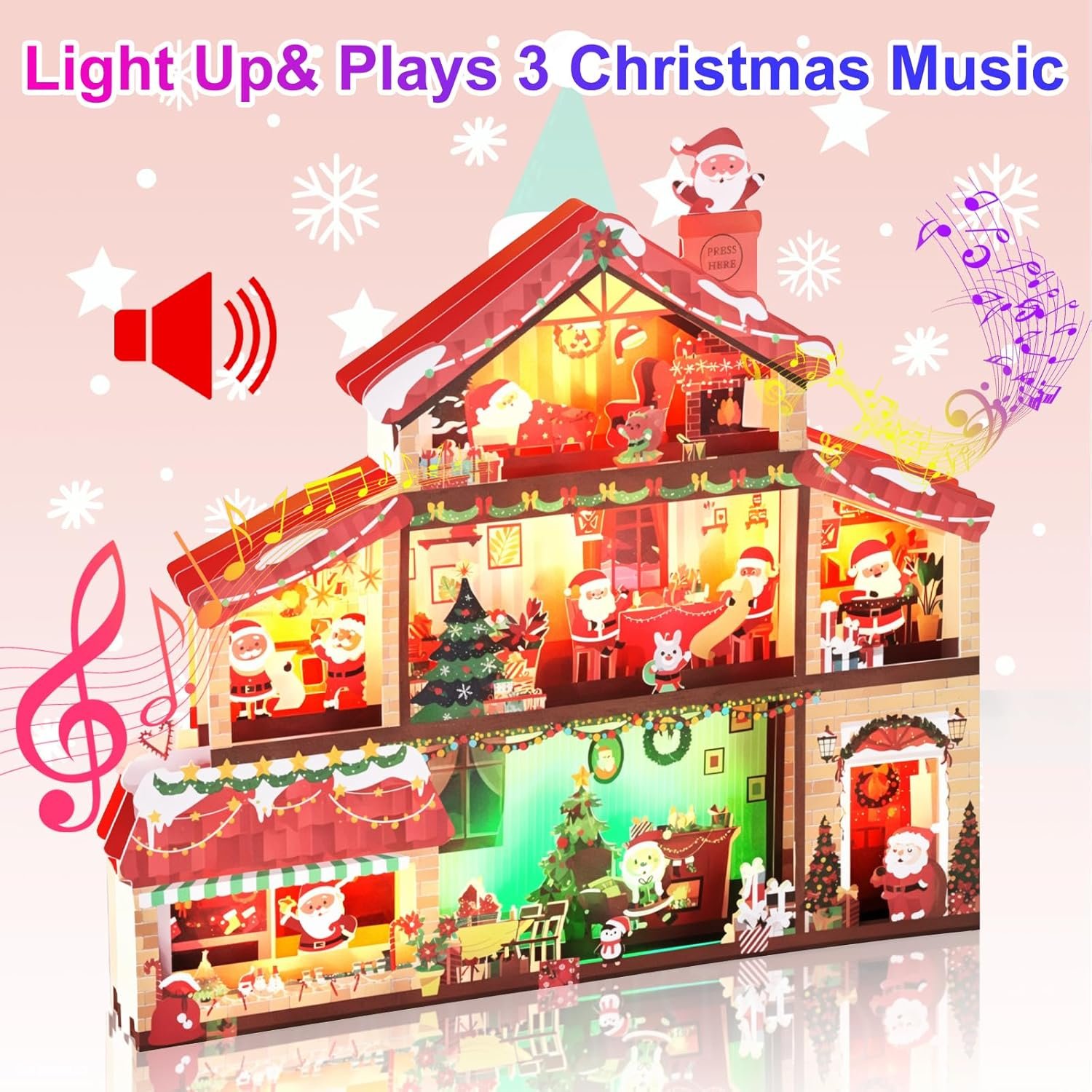【Music&Light Design】This Merry Christmas card adopting exquisite and unique 3D design. When you press the “PRESS HERE” button, the vibrant lights and music dance in sync, it adds a sense of christmas ritual and is the perfect choice for a christmas gift. Battery Include