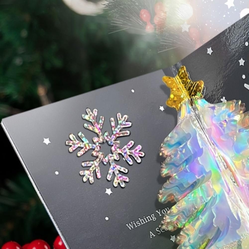 【Christmas Tree 3D Greeting Card】 The sparkling Christmas tree is laser cut from neon film, and the text and snowflakes on the cover are made using hot stamping technology. Opening the Christmas card gives a crystal dreamy feel and the Christmas tree takes on a sparkling look.