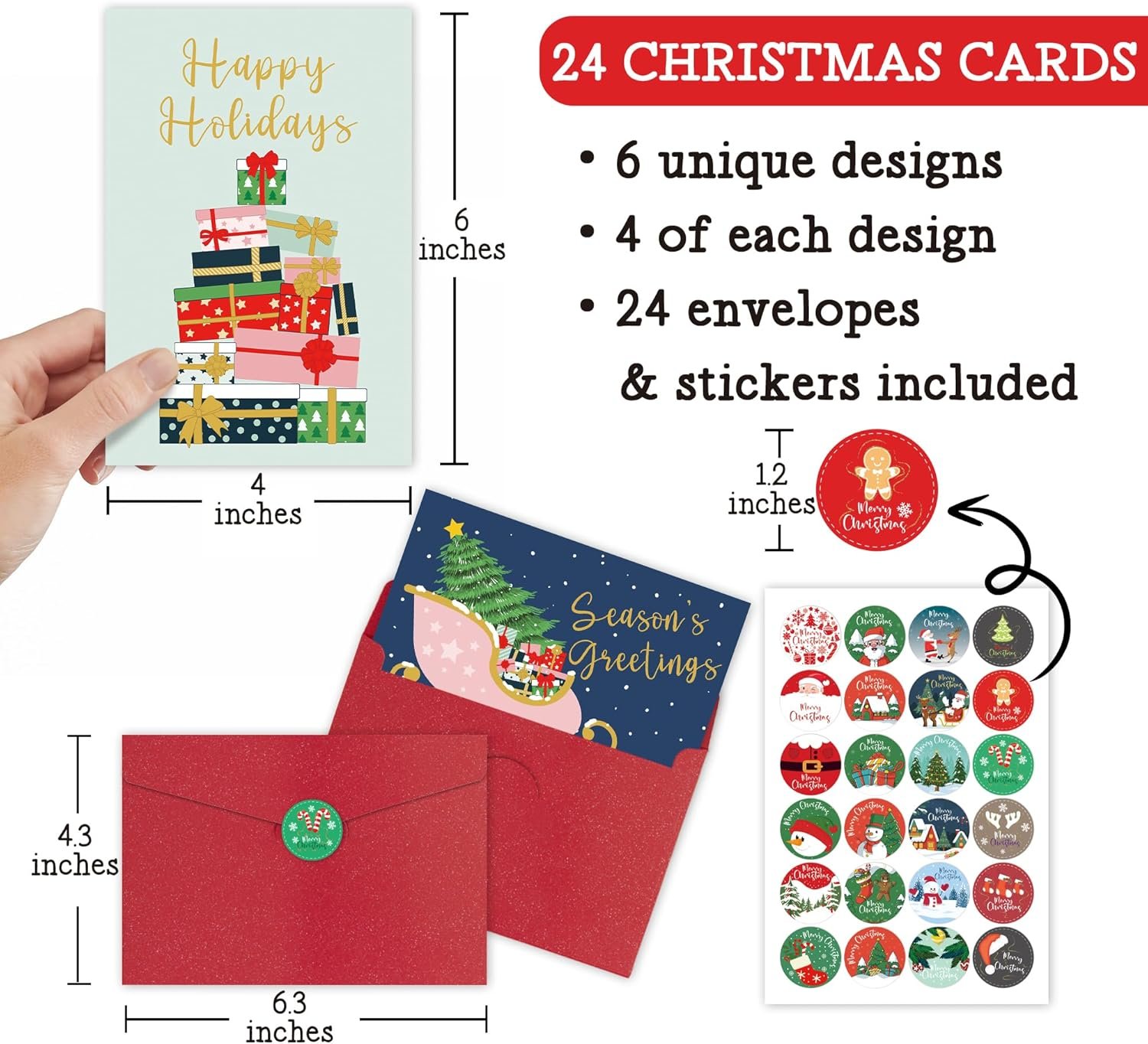 【Christmas Cards Set】:You will receive 24 pcs christmas cards, 24 pcs envelopes and stickers, sufficient quantity and the complete set to meet your needs of expressing your festival blessings to friends,family members,colleagues and relatives.