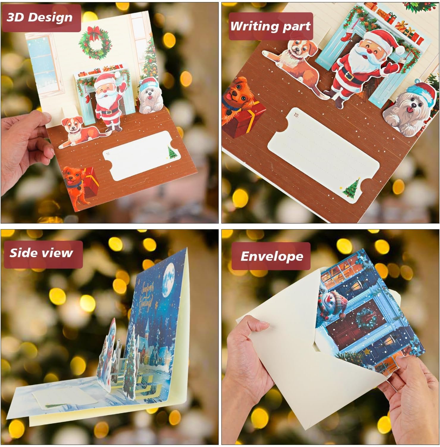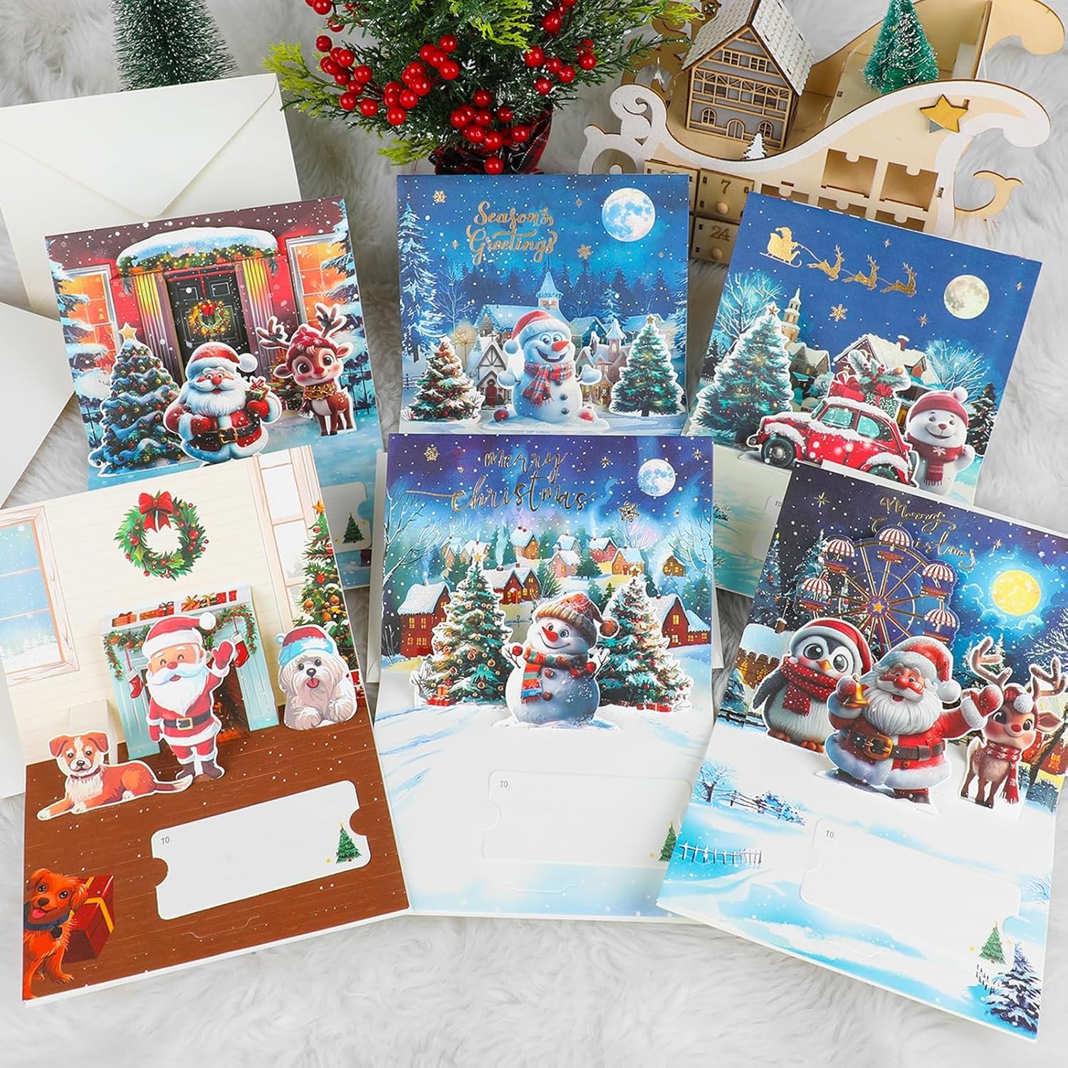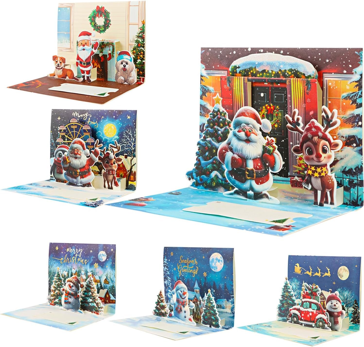 Creative 3D Design: Beautiful pop up art of christmas tree, snowman, dog, car, Penguin, santa and Reindeer. Add your own words on the 3D greeting cards, warm with the best wishes and love. Perfect as a new year card, Christmas gift card