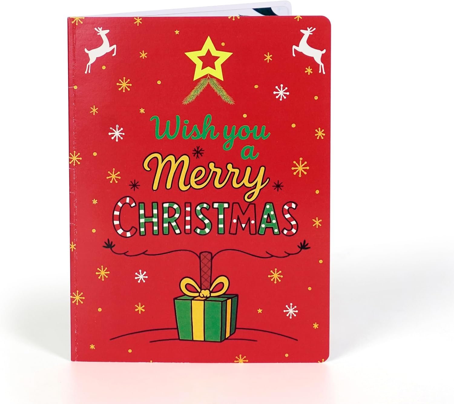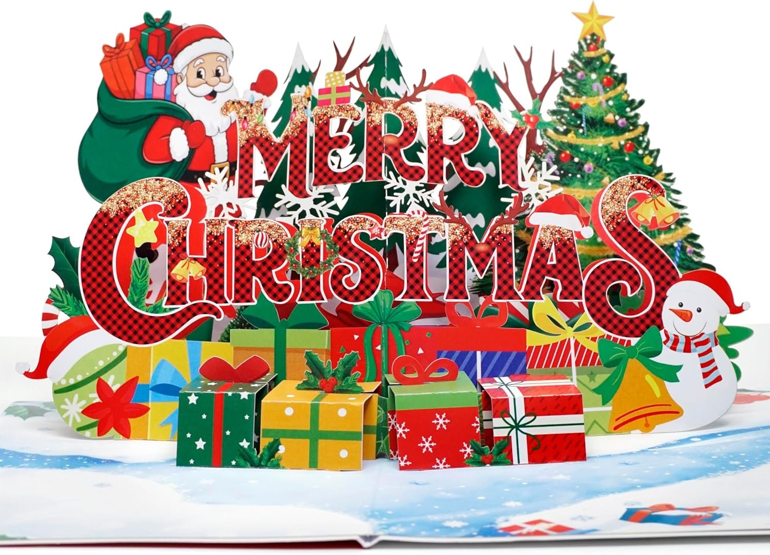 UNIQUE DESIGN: When the 3D card is opened, bold red “Merry Christmas” letters appear atop a blanket of snow. Around them sit colorful gift boxes and a jolly Santa Claus, with rows of snow-covered trees stretching into the wintry distance.
