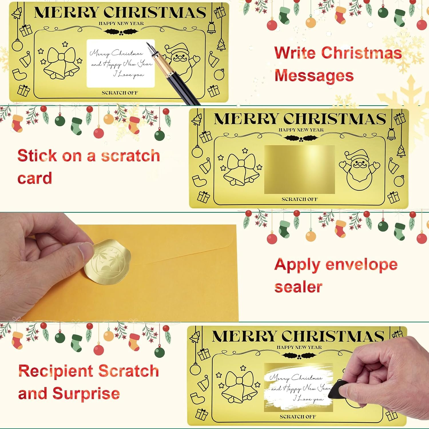 【SET OF 6 CHRISTMAS SCRATCH CARDS】6 x Christmas scratch cards; 6 x Golden envelopes; 8 x Scratch off labels; 1 x Envelope closure sticker.
