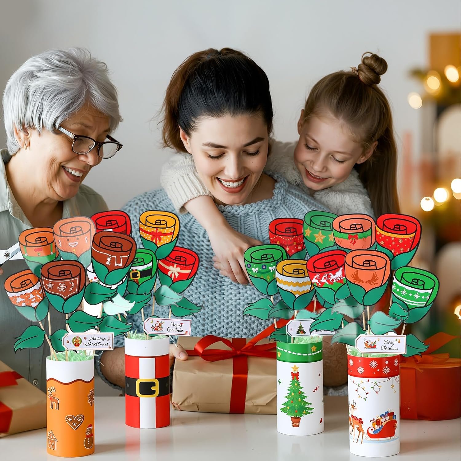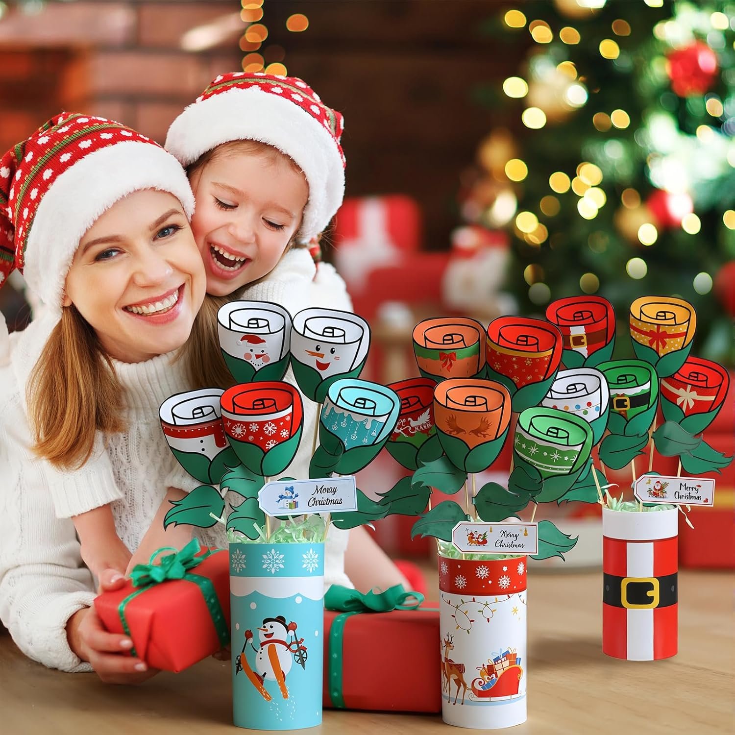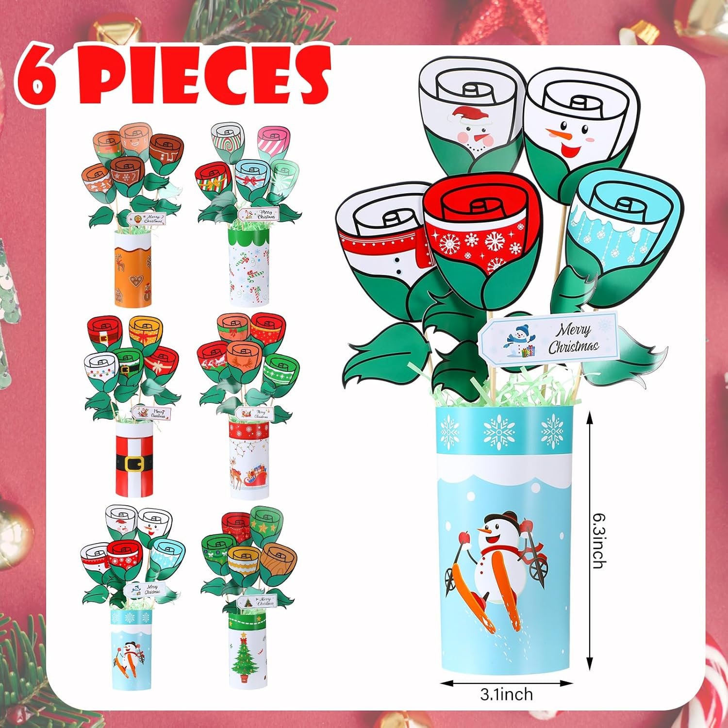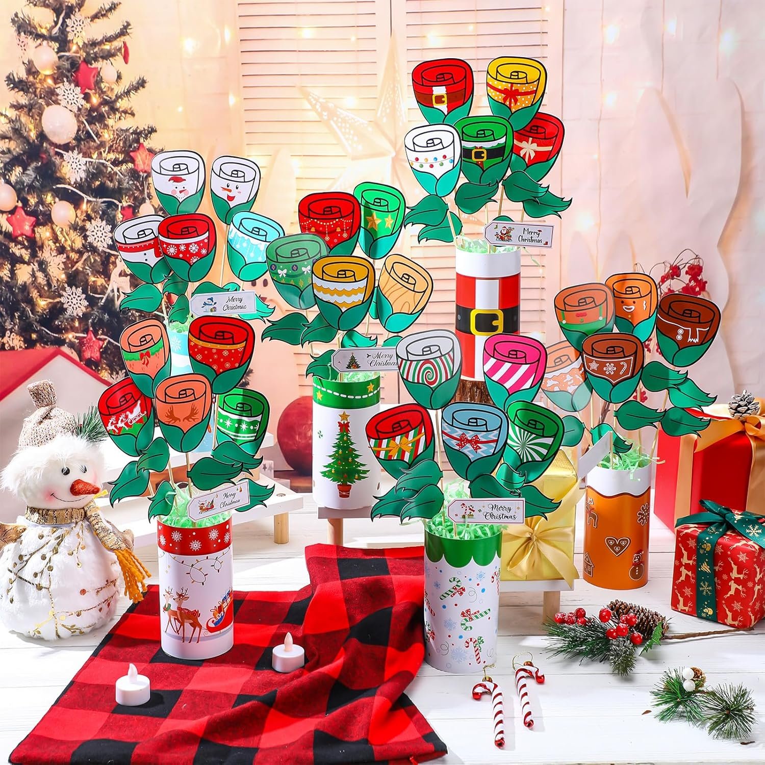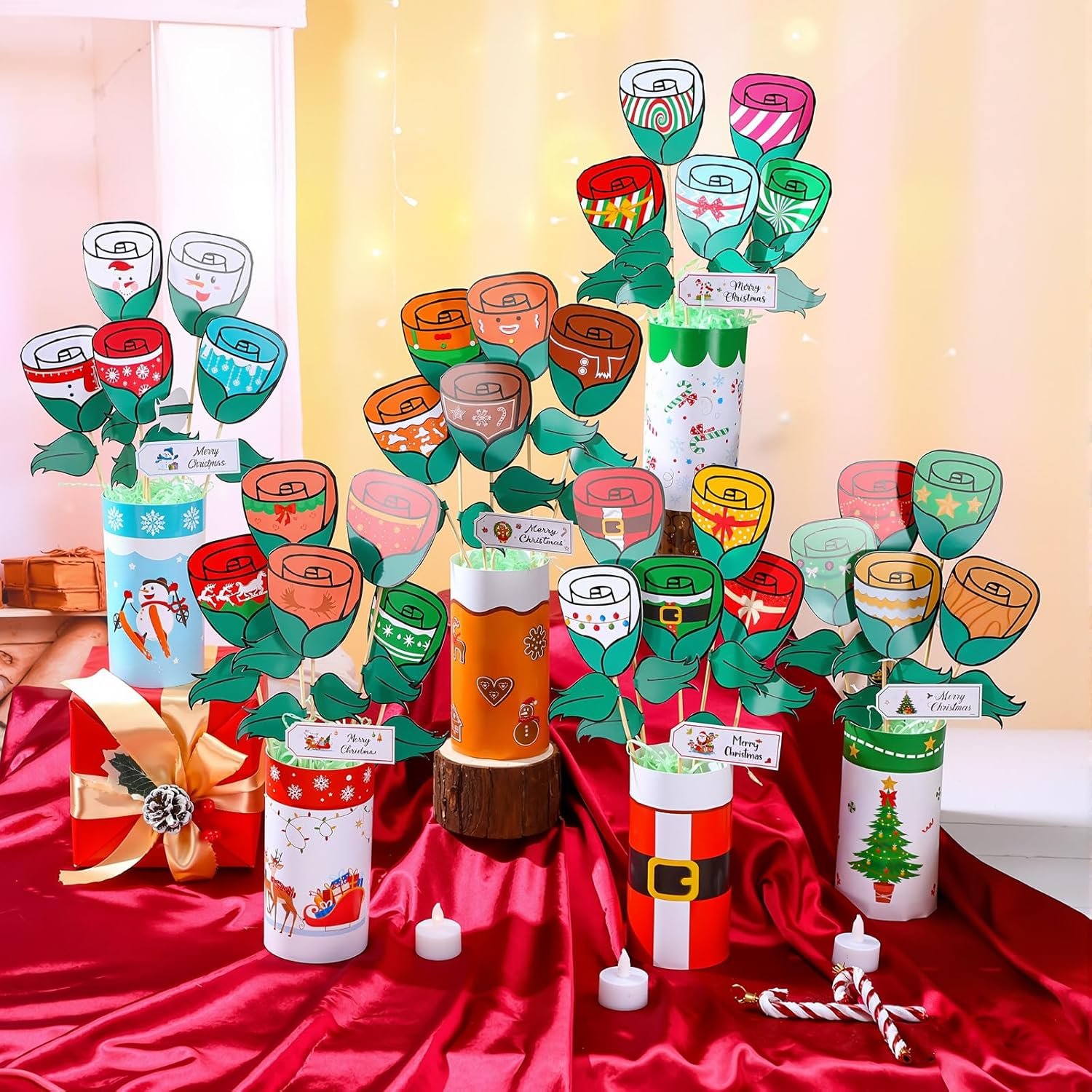 Product Design and Usage Method: clear patterns and text, exquisite designs. It does not fade and is convenient for Diy. It is easy to combine and stick, and the product patterns are in line with the Christmas atmosphere. When a rectangular card is rolled up, it becomes the base of the bouquet. Then, they are stuck together, and a foam base and raffia grass are inserted into the signature. When the card and the signature are stuck together, it becomes a creative bouquet