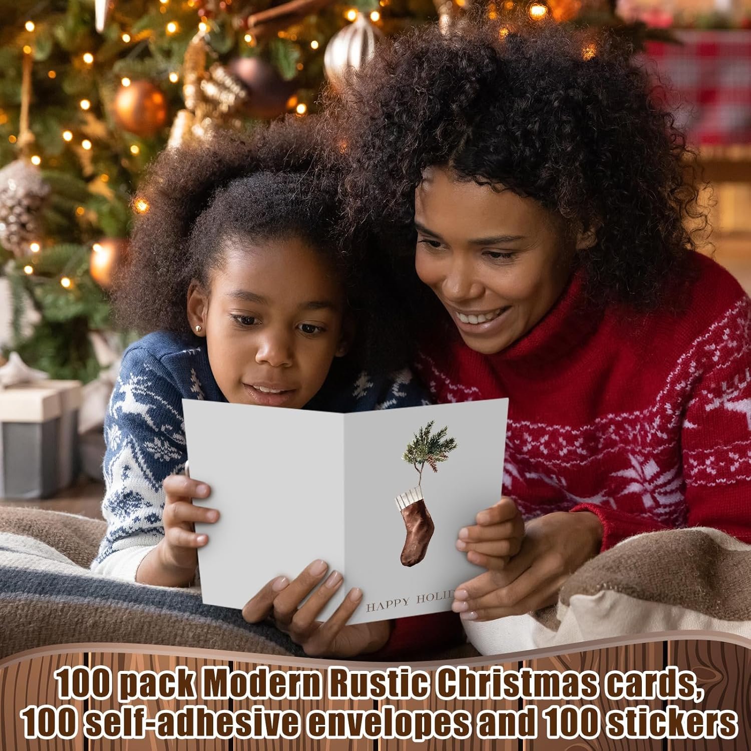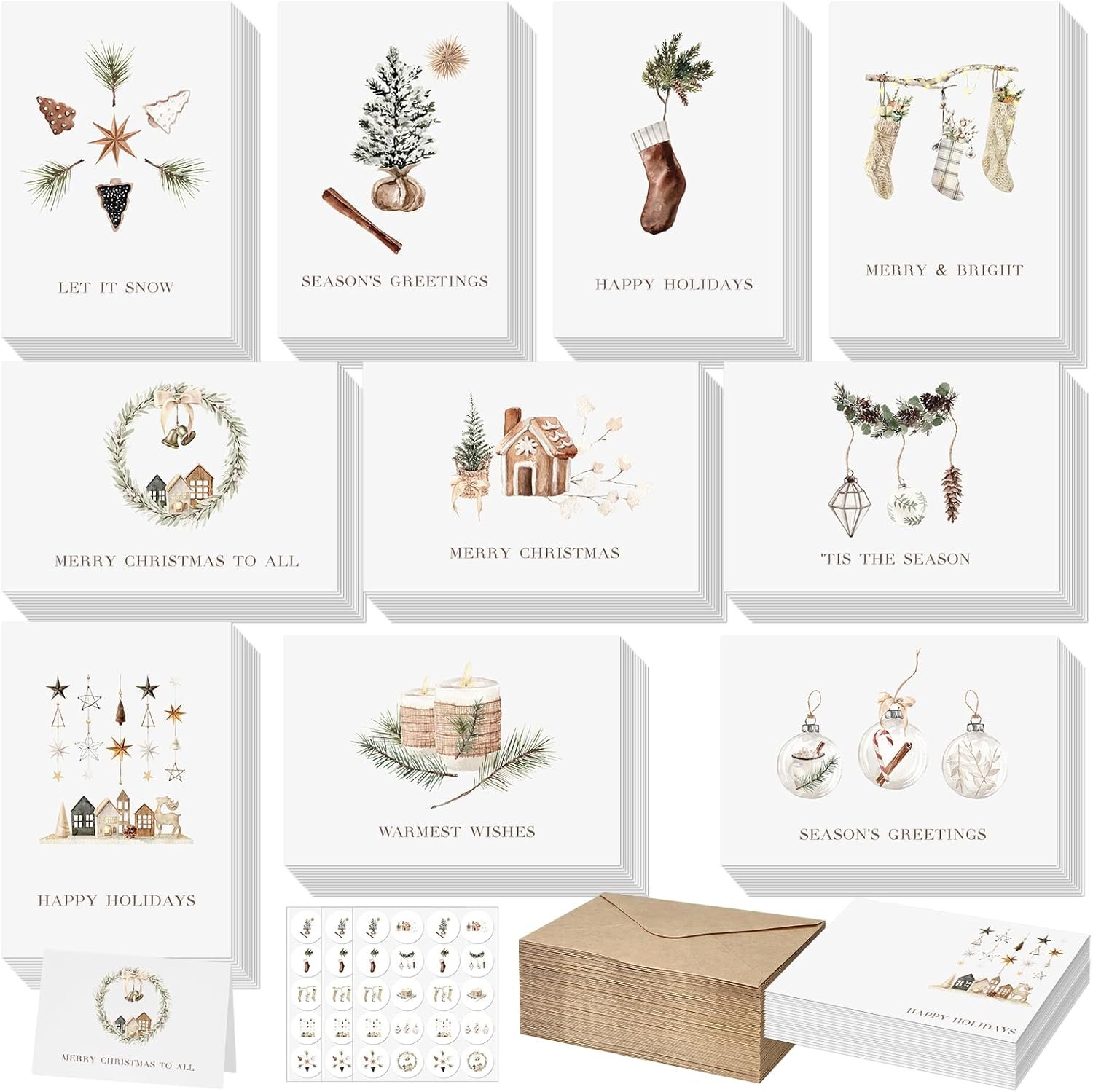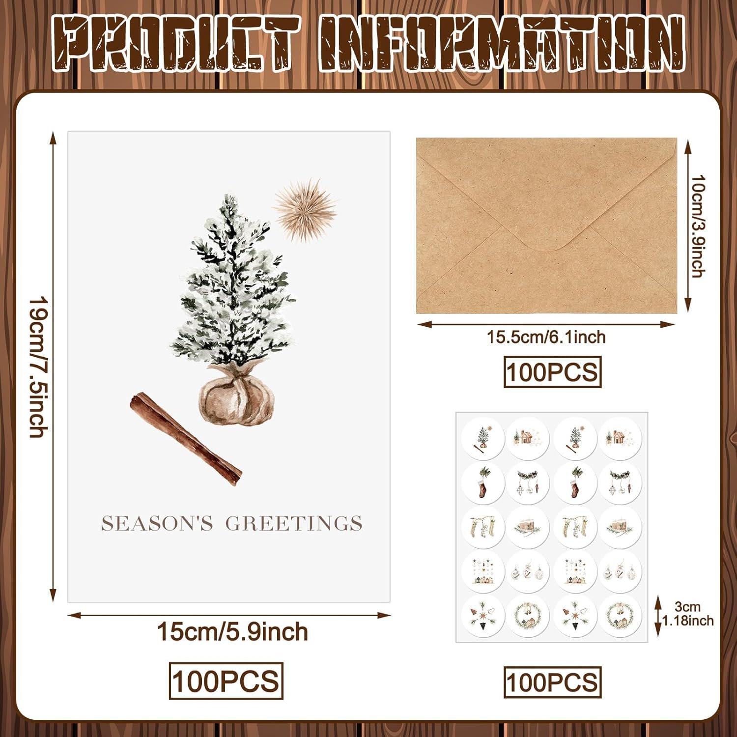 Generous Package: every purchase comes complete with a generous package of 100 sets of modern rustic Christmas cards; Each set includes an envelope and a sticker, giving you everything you need to spread Christmas cheer among your friends, family, and neighbors