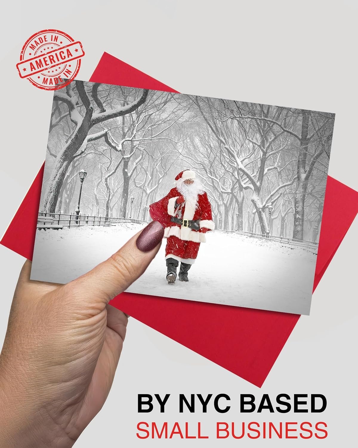 Each card is printed on premium 120# linen card-stock using high-end digital technology for vivid color and crisp detail. Designed by a NYC-based small business, the card features original photography that captures Santa strolling through a snowy Central Park. Made in the USA with care, it’s perfect for gifting, mailing, or framing as a keepsake.
