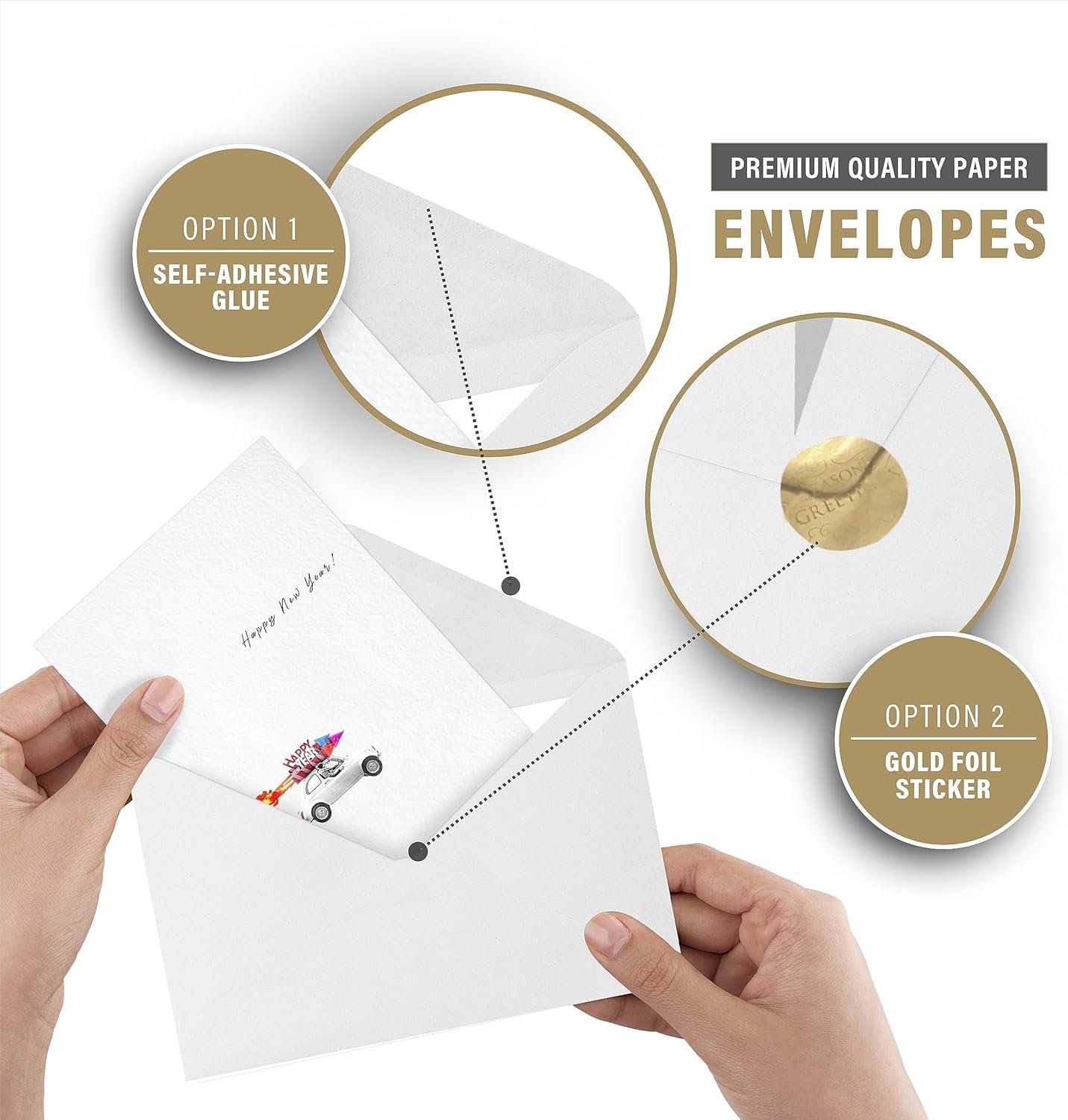 Premium & Thick Cardstock – These New Year greeting cards bulk are printed on high quality Texture Card stock with off white thick paper mailing envelopes. Our top notch printing technology leaves crisp, clear colors without smudged lines or fades. Each envelope with adhesive glue for easy closure & also it comes with an additional 18 pcs sealing stickers in gold foil “Seasons Greetings”.