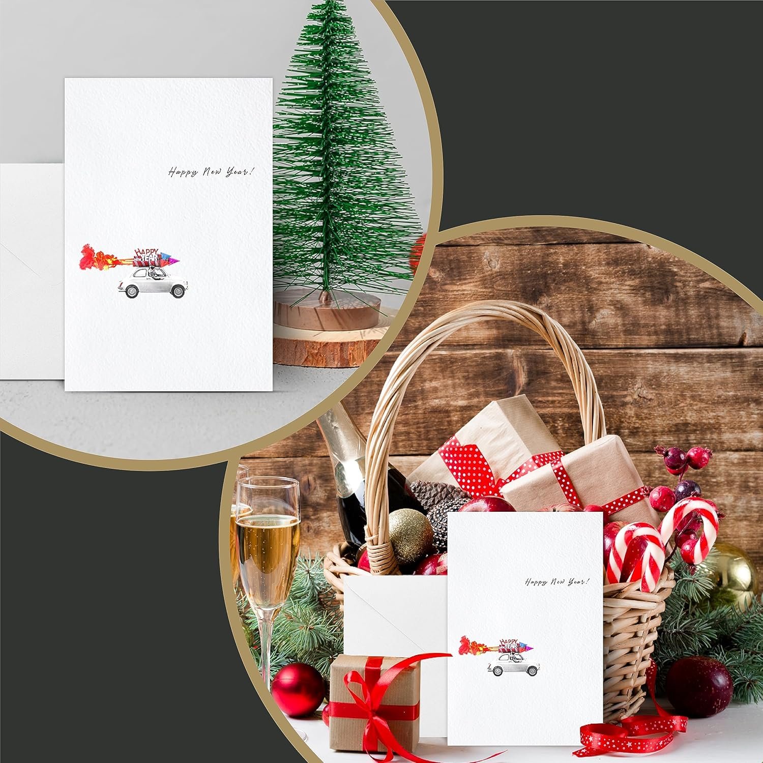Spot UV & Embossed Happy New Year Cards – a set of 16 cards, each paired with off-white mailing envelopes. These cards boast a sleek and minimal design, accentuated by a raised spot UV effect featuring a vintage car motif, lending a subtle and sophisticated texture to the card stock