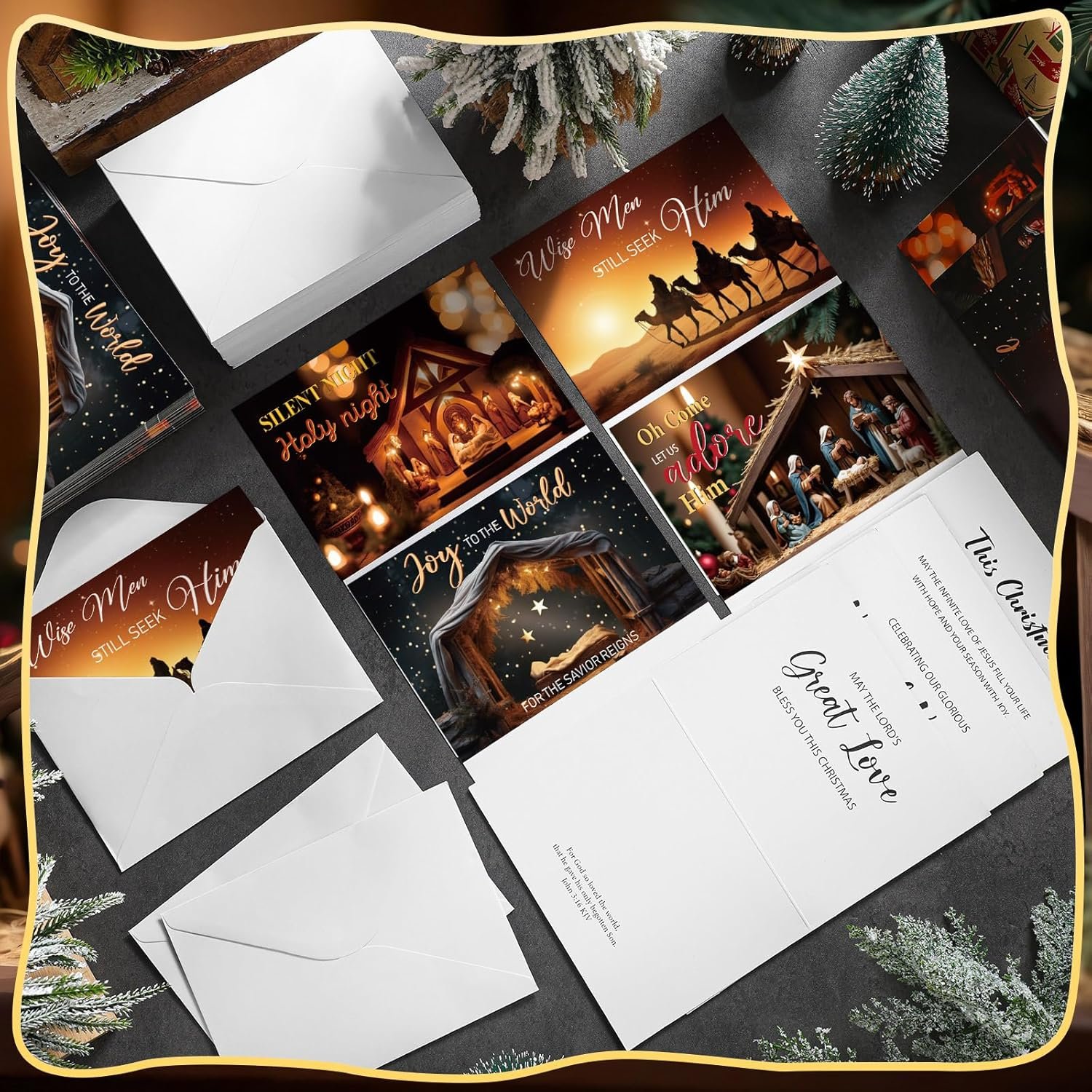 Send Christmas Greetings: enjoy the holiday with our multicolor religious Christmas cards; The package includes 100 cards with 4 beautiful designs and matched sized envelopes; It beautifully caters to your bulk requirement for Christmas greetings
