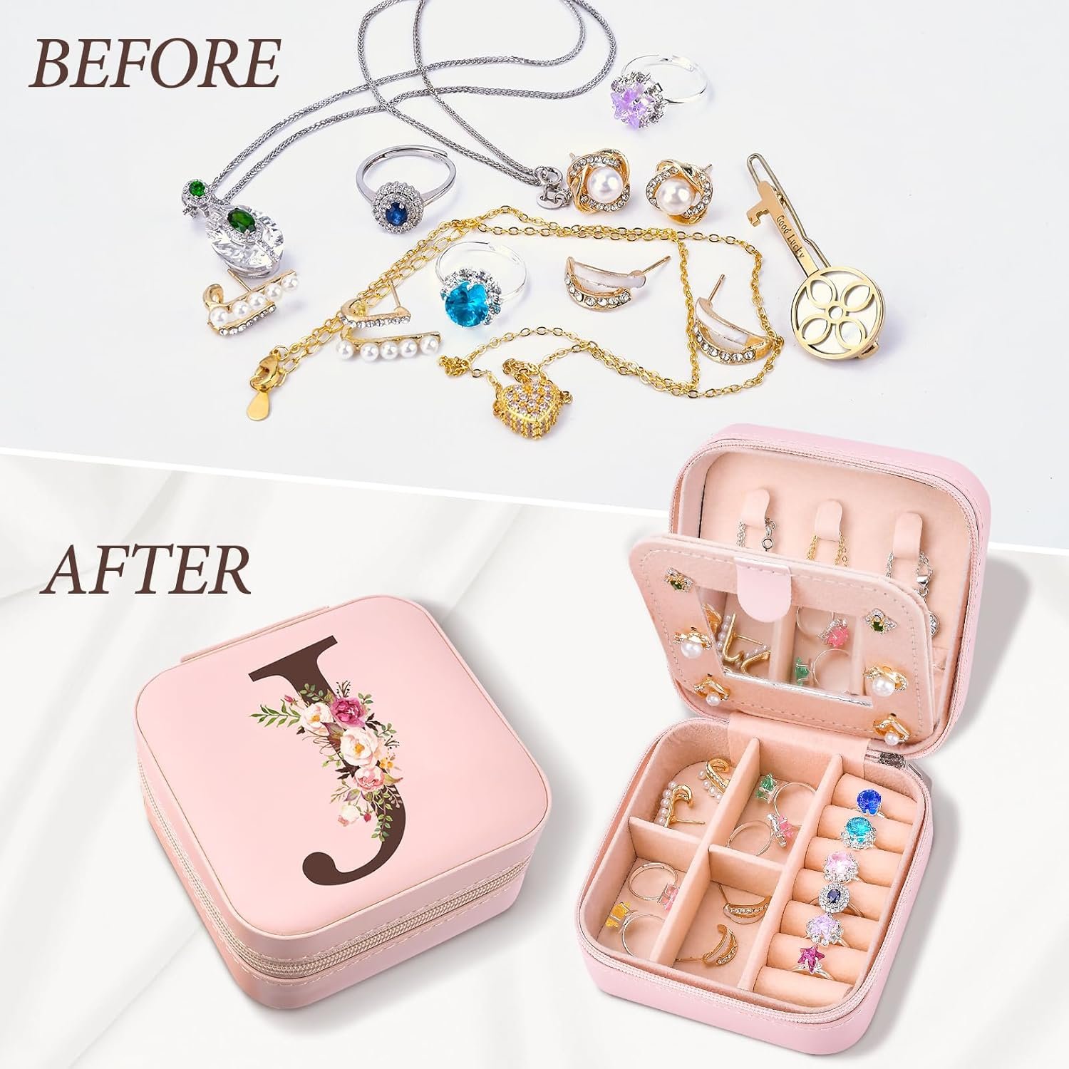 Organized Jewelry: This travel jewelry box will keep your jewelry organized, prevent your necklace from tangling, so that you can quickly and easily find rings, earrings, and other beautiful jewelry. The built-in mirror makes it easy to makeup at any time