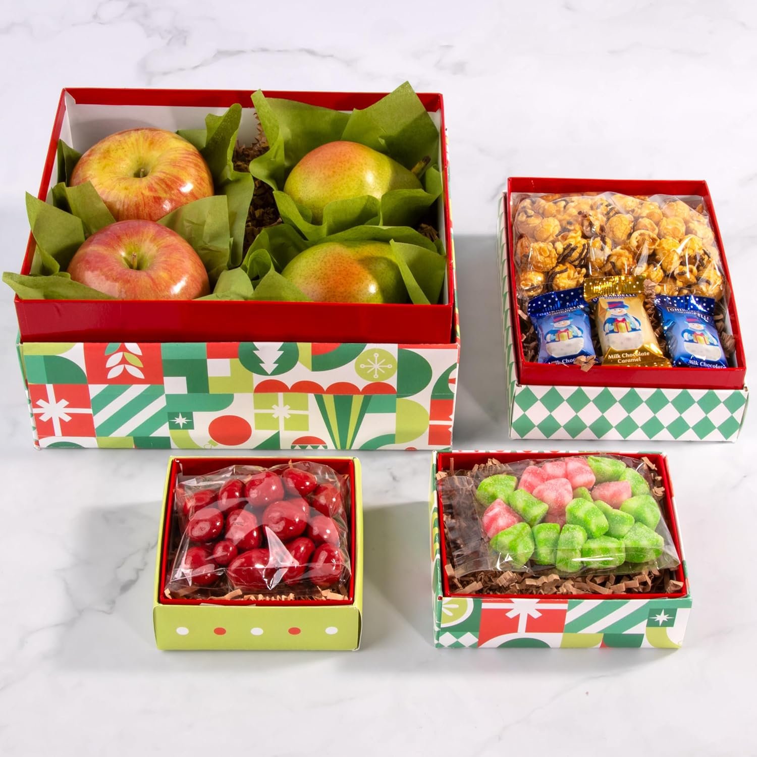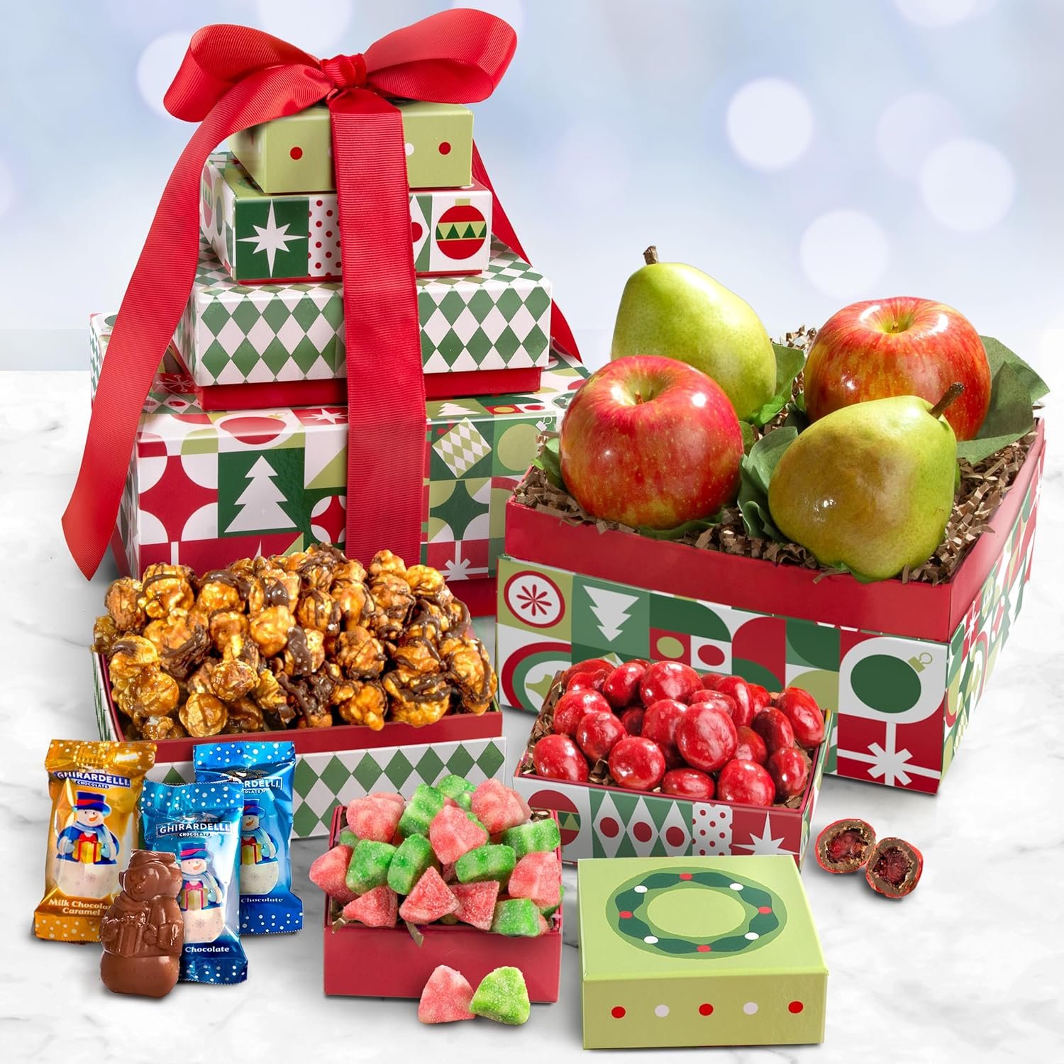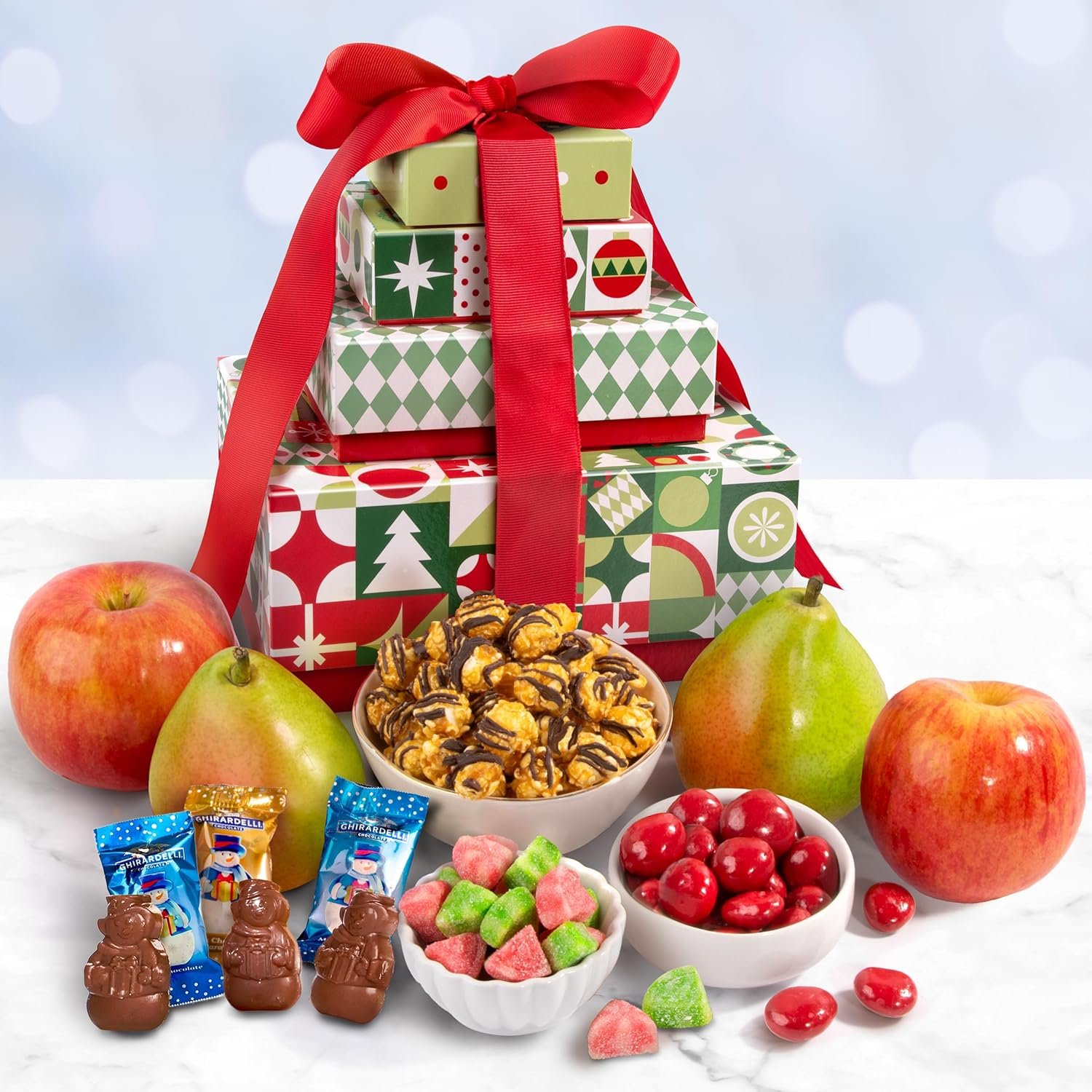 This four piece tower is full of festive delights like juicy fresh fruit, chocolate covered cherries, Ghirardelli chocolate snowmen, and dark drizzled caramel popcorn and red and green fruit gels, all packed into beautiful keepsake tower boxes for the perfect gift presentation.