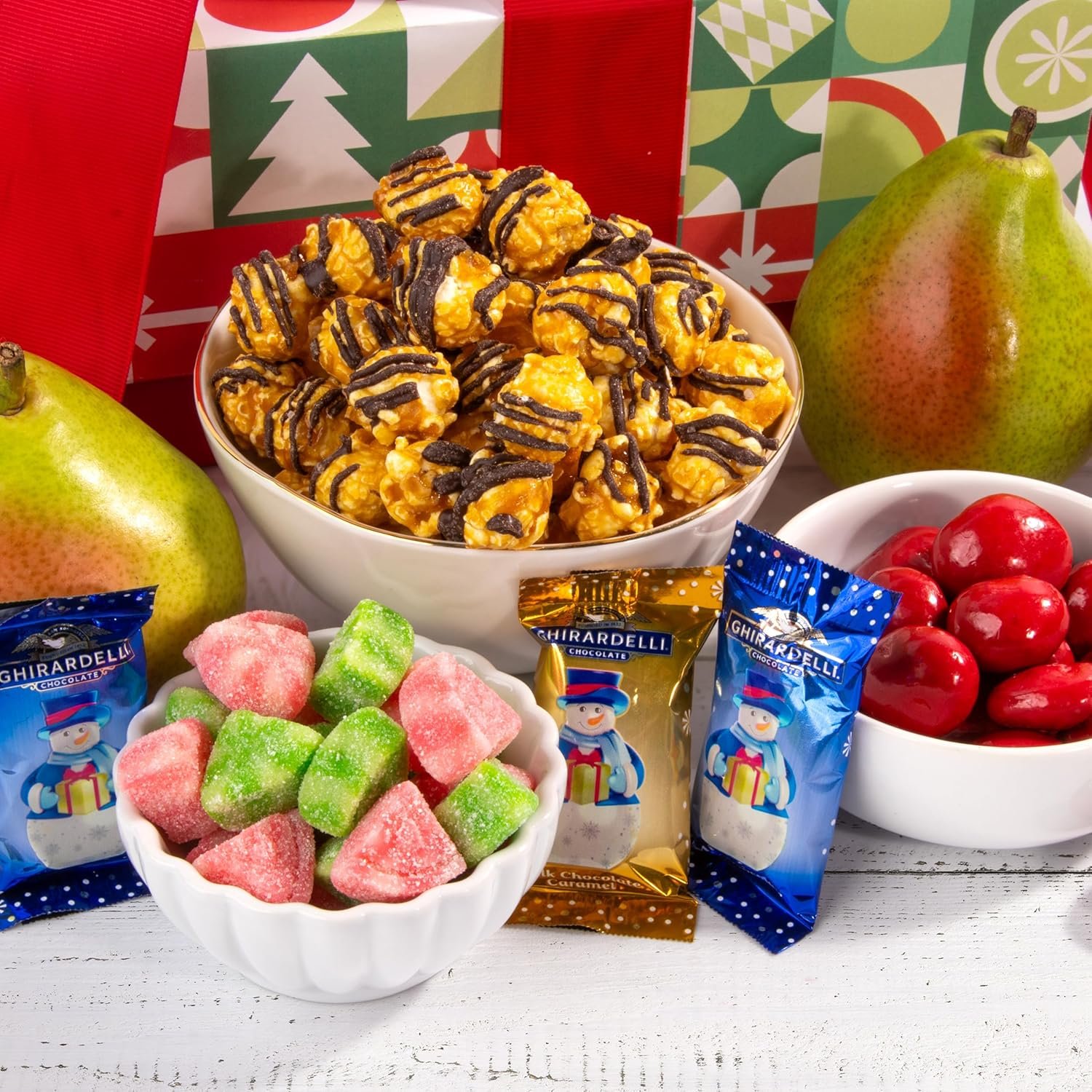 Finished with festive Ghirardelli chocolate foil wrapped chocolate snowmen and red and green fruit gels.