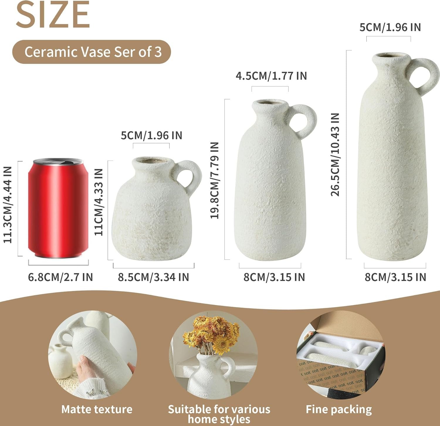 【For Multiple Home Décor Styles】Designed in a variety of shapes and sizes, this rustic vases set is a perfect home décor even without flowers. Whether your style is bohemian, modern farmhouse, rustic, or homey, they all fit in perfectly show off your lifestyle and decorative sense of style. (Length X Diameter=10.43X3.15″, 7.79X3.15″,4.33X3.34″).