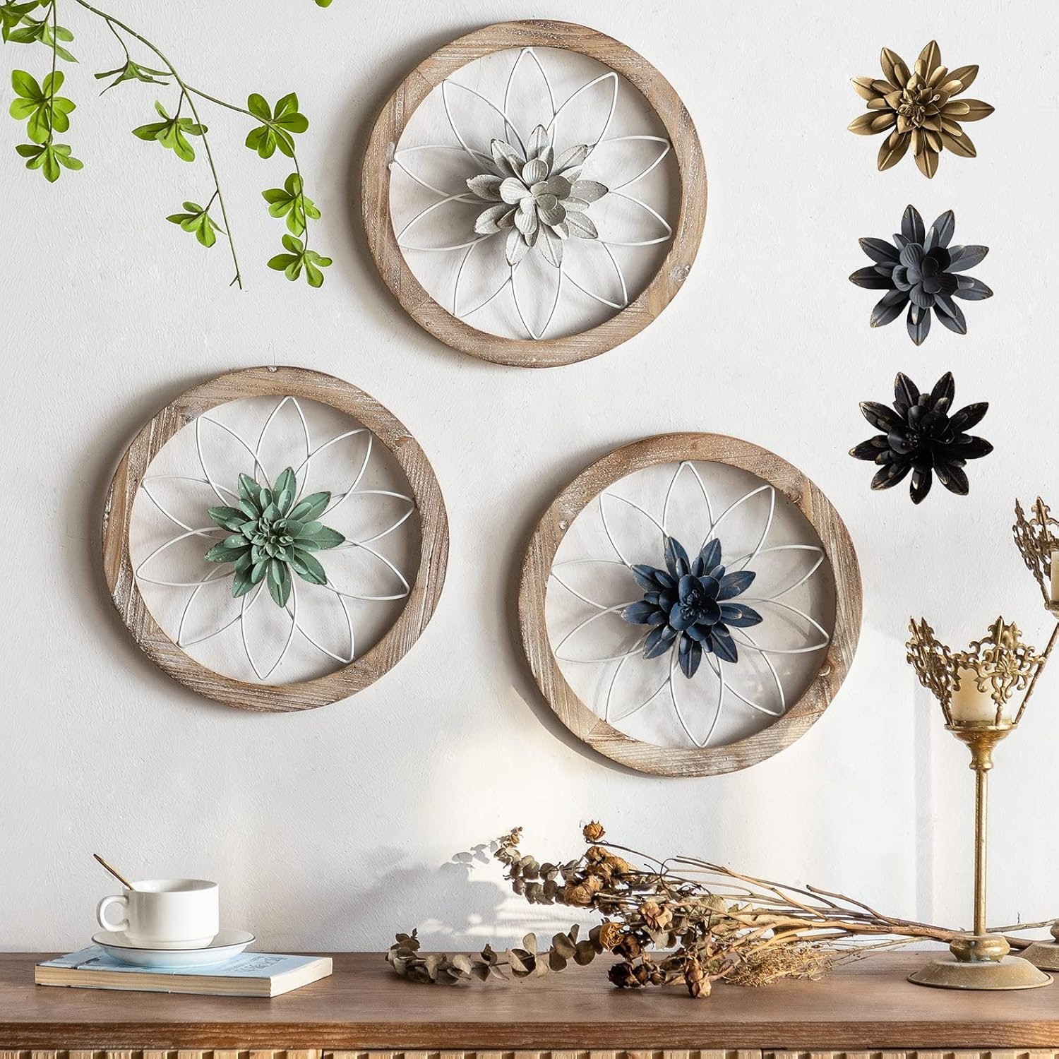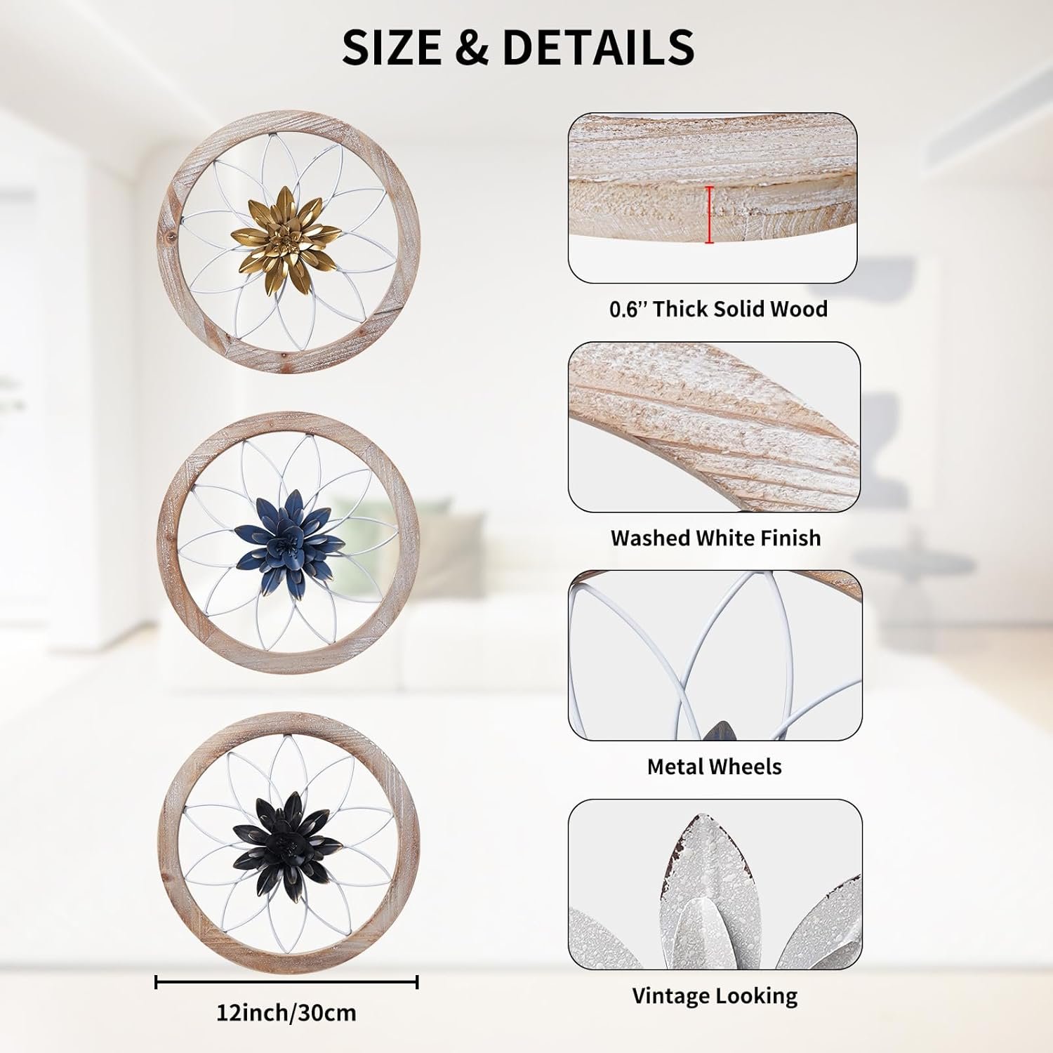 FARMHOUSE WALL DECOR — These 3 pcs round kitchen wall decor made of fir wood frame and metal wheels, come with 6 replaceable metal flowers, the rustic style is perfect for both modern or farmhouse home decor