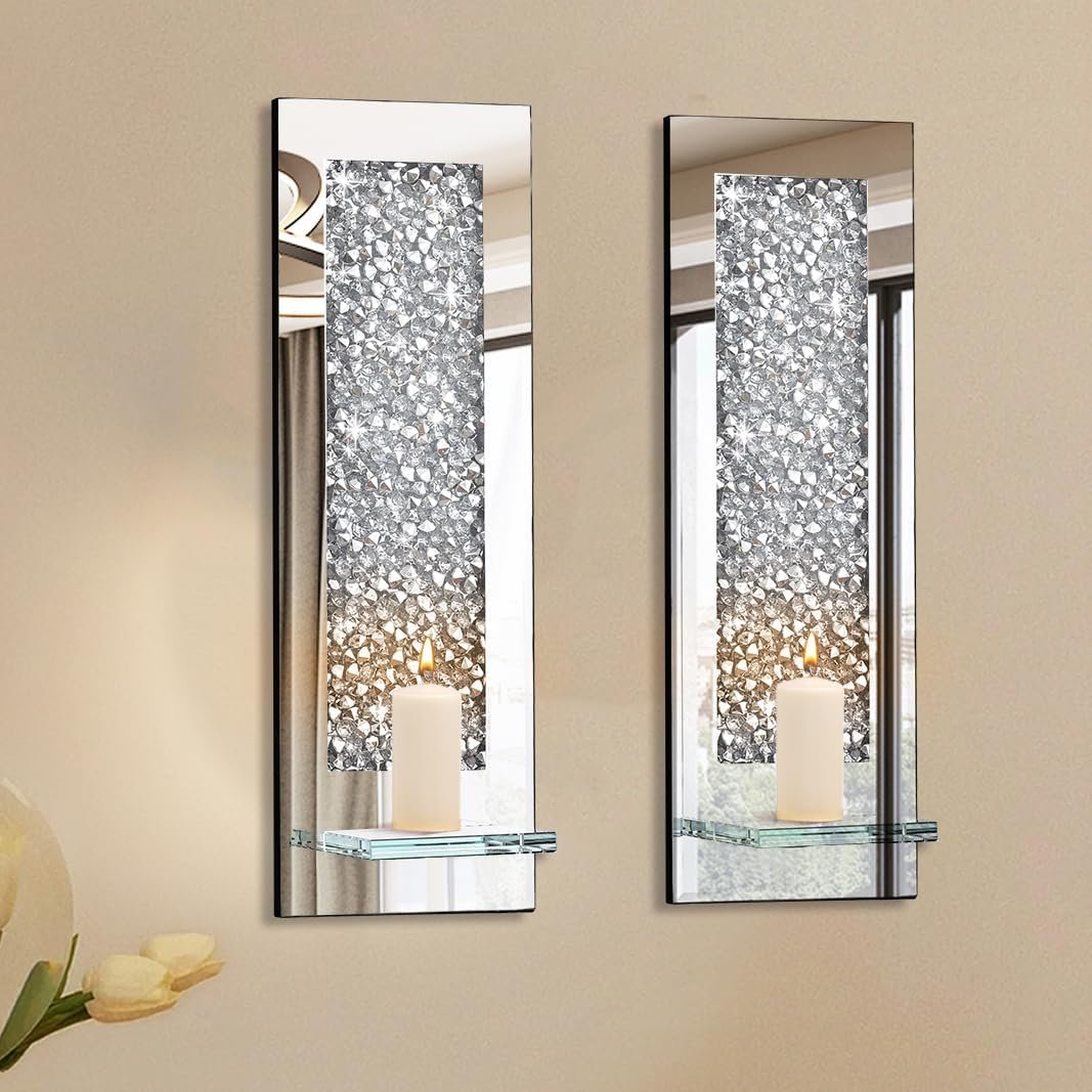 Product Size: 15x5x4.1 inch. Rectangle frameless design with Sparkle Twinkle Bling Crystal Crush Diamond. Mirrored Candle Sconces for wall decoration. Classic and modern design.